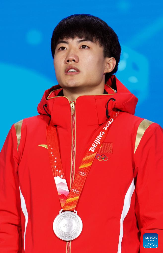 Silver medalist Li Wenlong of China reacts during the awarding ceremony of men's 1000m of short track speed skating at the Beijing Medals Plaza of the Winter Olympics in Beijing, capital of China, Feb. 8, 2022. (Xinhua/Ju Huanzong)