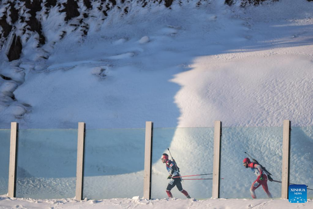 Maksim Varabei (L) of Belarus and Paul Schommer of the United States compete during biathlon men's 20km individual at National Biathlon Centre in Zhangjiakou, north China's Hebei Province, Feb. 8, 2022. (Xinhua/Ding Ting)