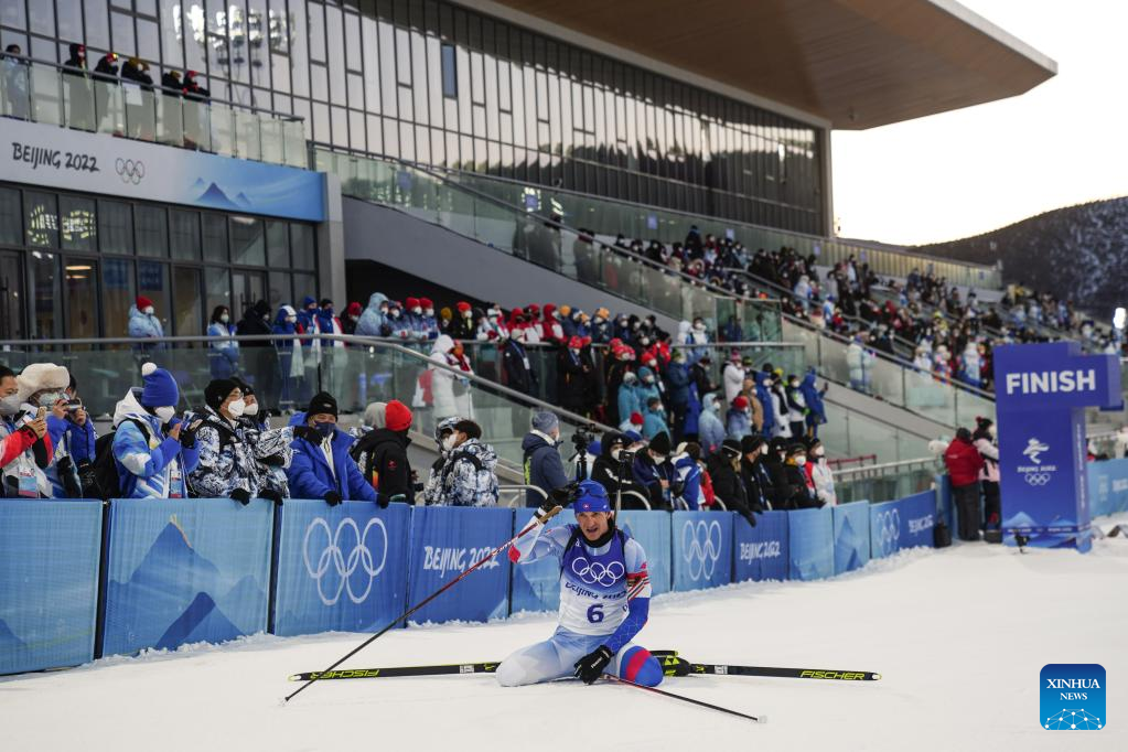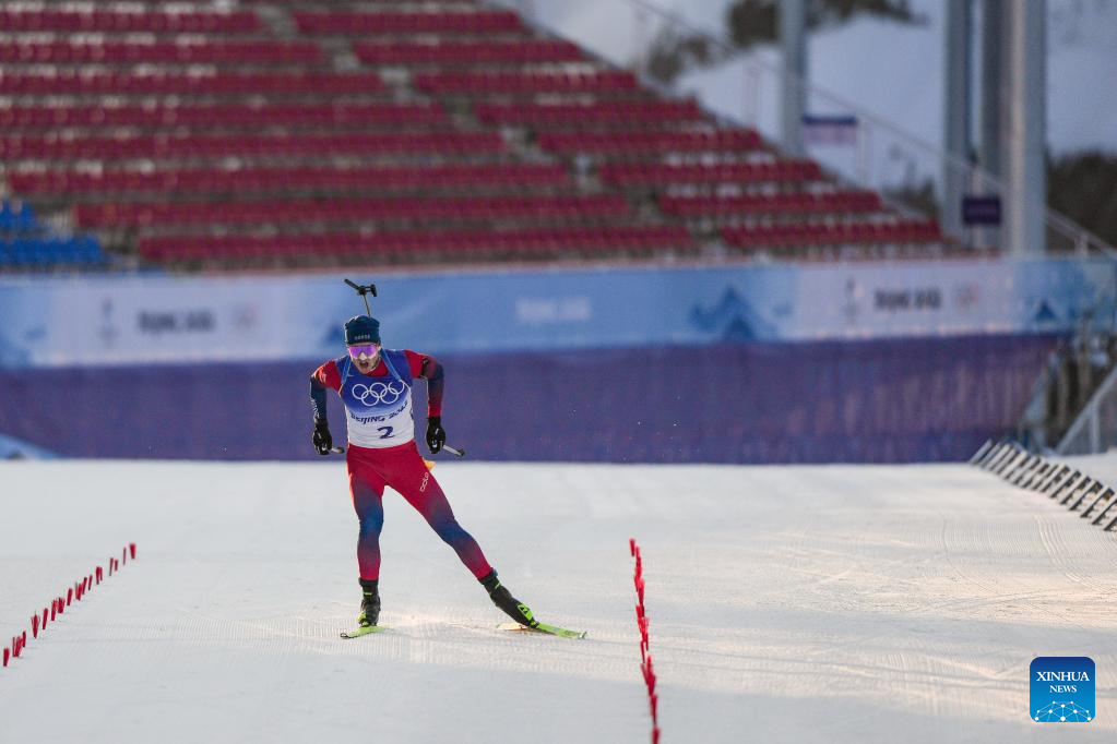 Johannes Thingnes Boe of Norway rushes to the finish line during biathlon men's 20km individual at National Biathlon Centre in Zhangjiakou, north China's Hebei Province, Feb. 8, 2022. (Xinhua/Peng Ziyang)
