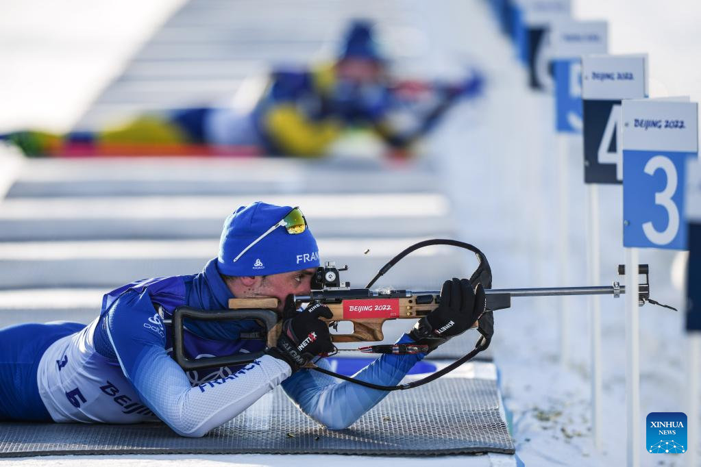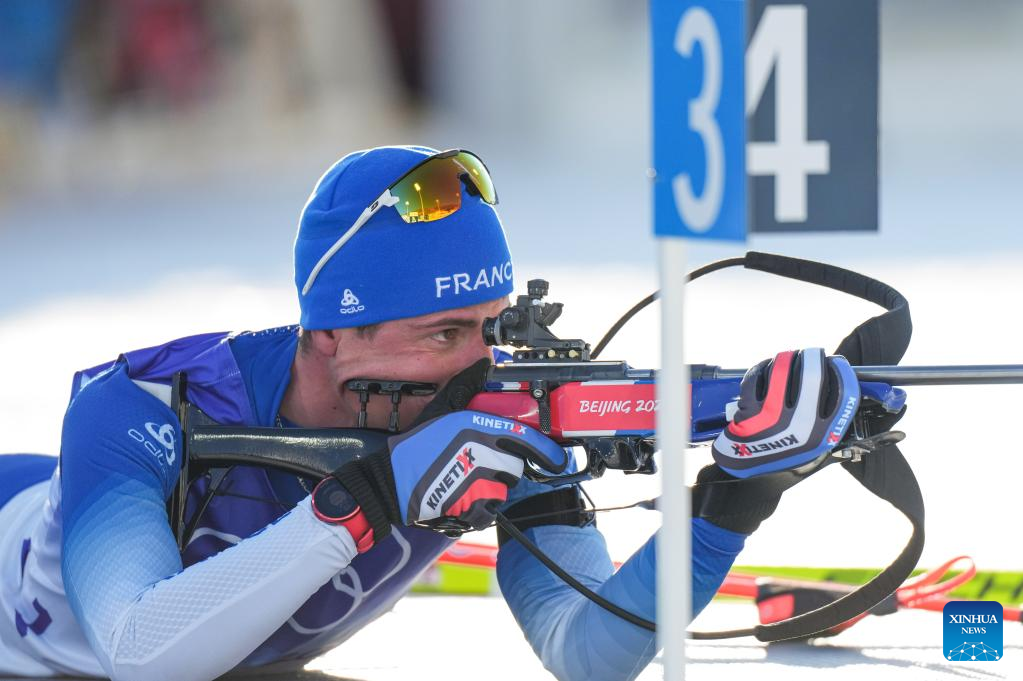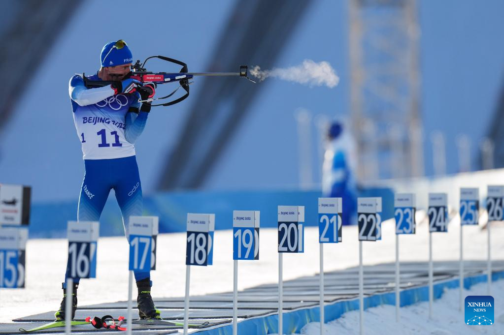 Simon Desthieux of France competes during biathlon men's 20km individual at National Biathlon Centre in Zhangjiakou, north China's Hebei Province, Feb. 8, 2022. (Xinhua/Peng Ziyang)