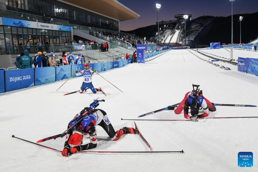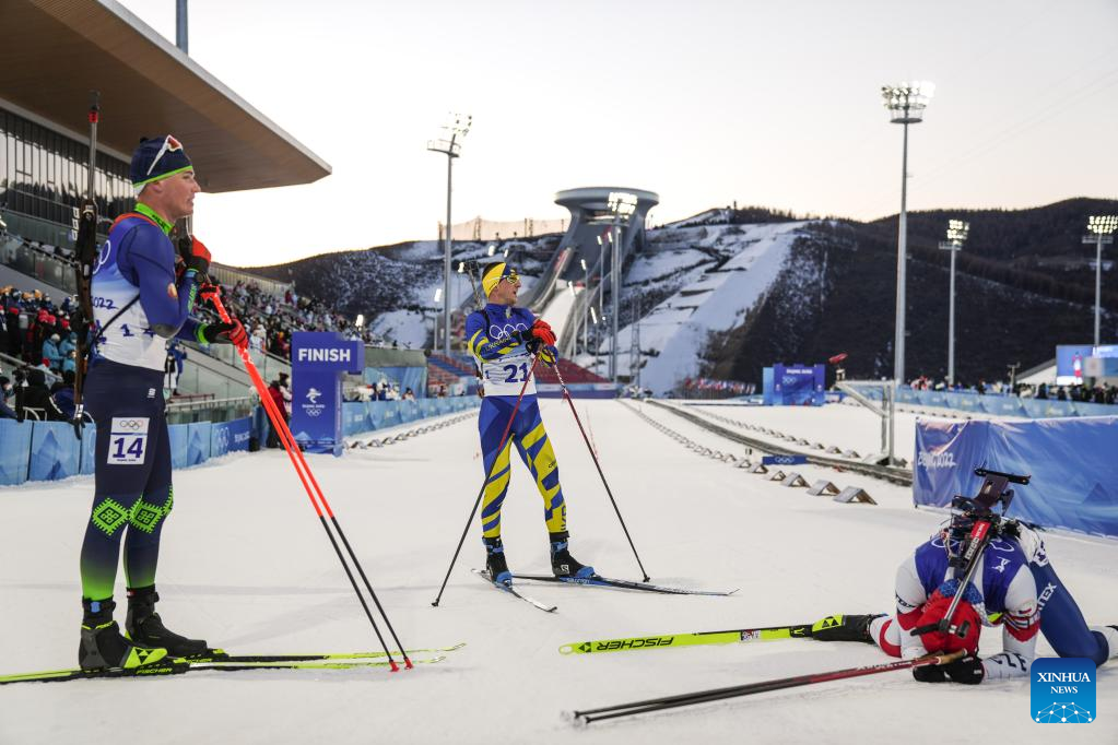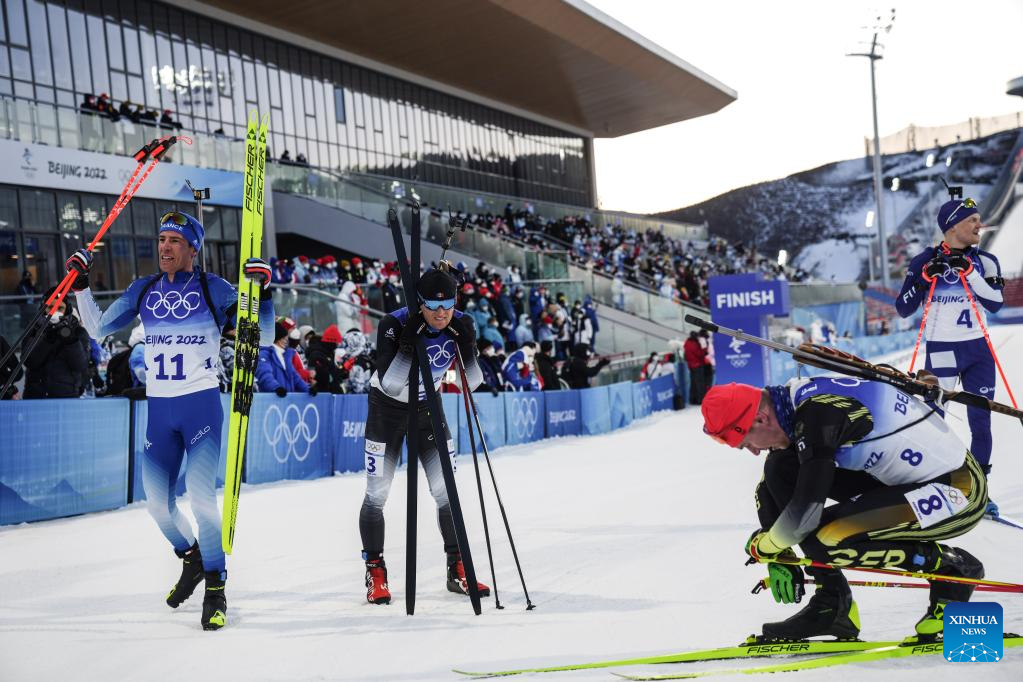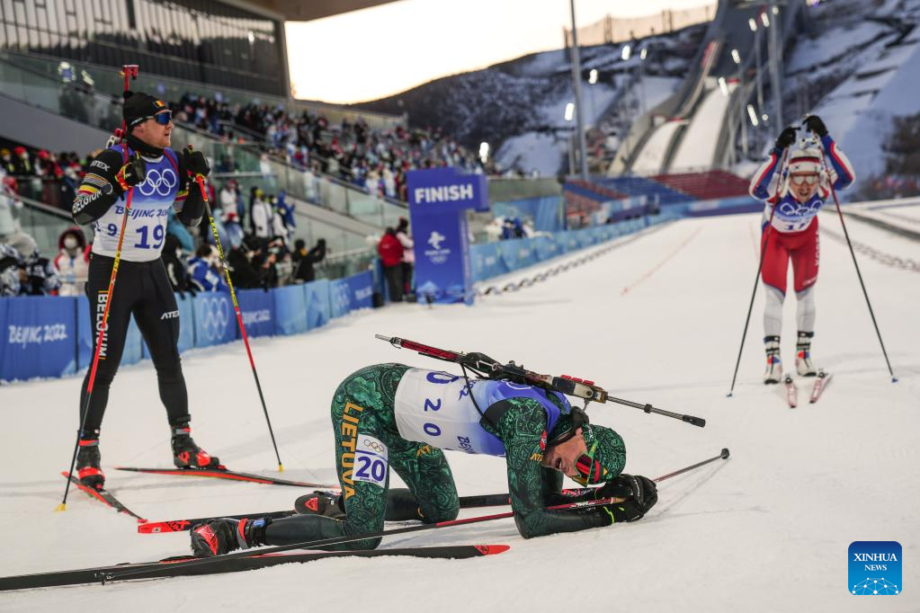 Vytautas Strolia (C) of Lithuania rests after crossing the finish line of biathlon men's 20km individual at National Biathlon Centre in Zhangjiakou, north China's Hebei Province, Feb. 8, 2022. (Xinhua/Peng Ziyang)