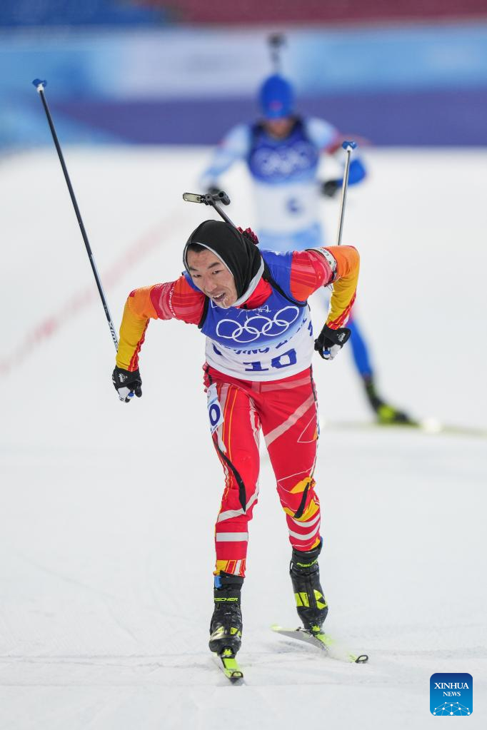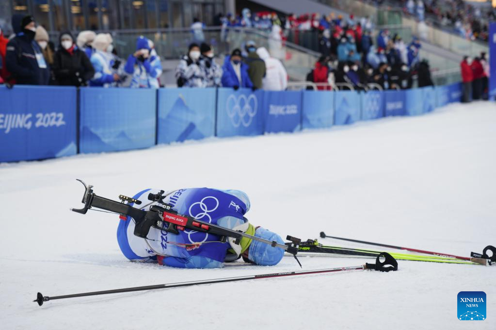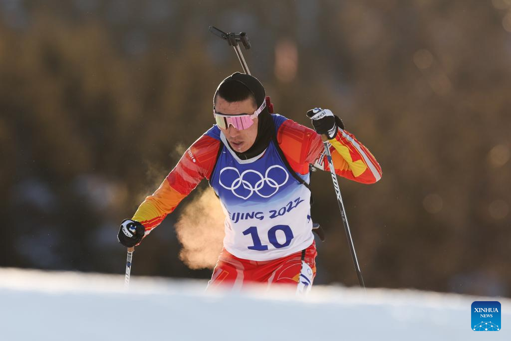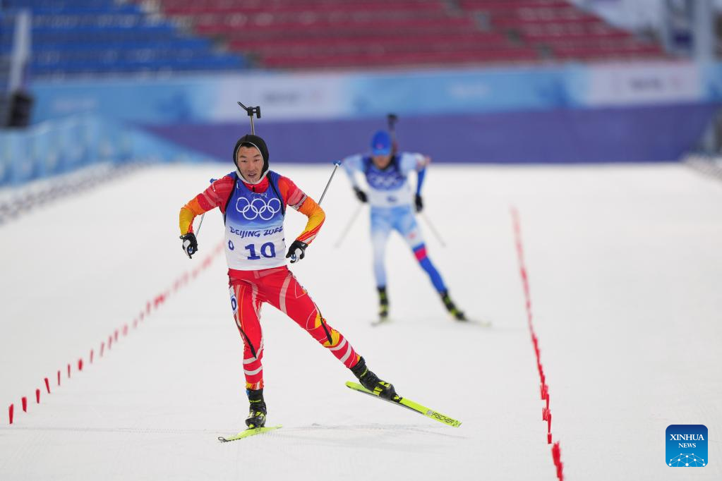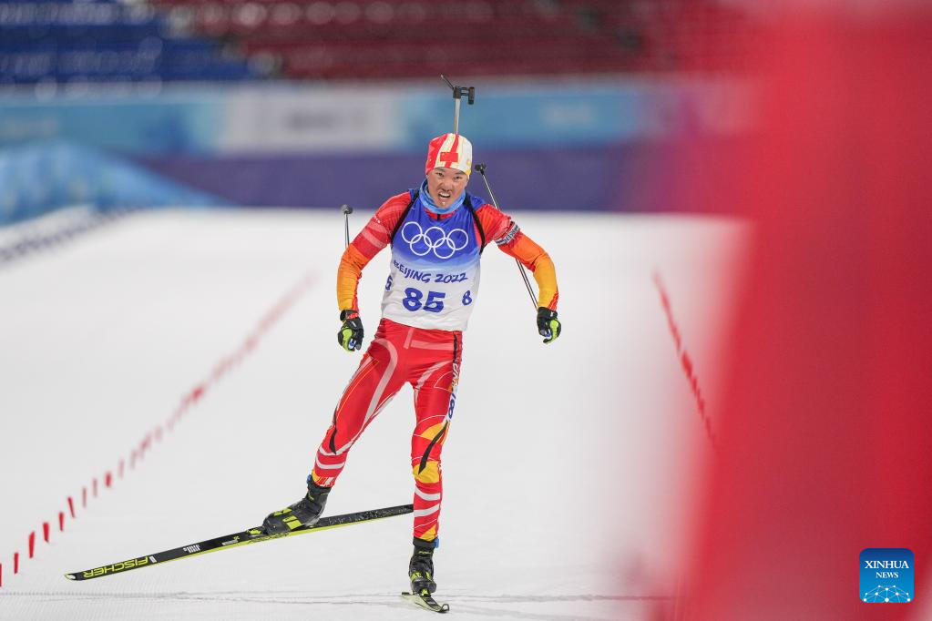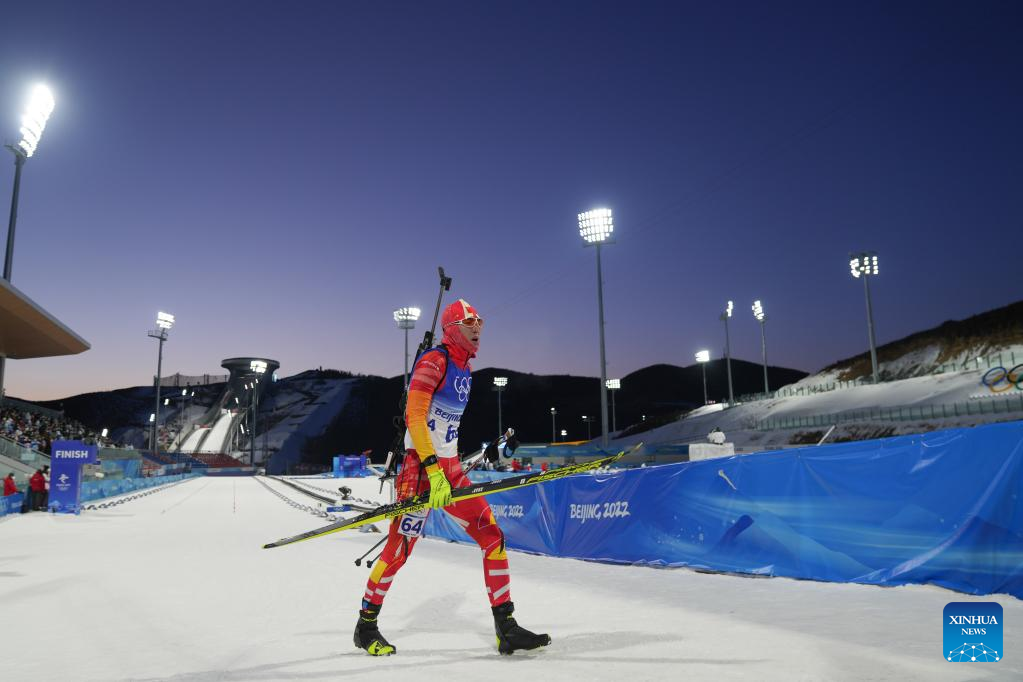 Zhu Zhenyu of China crosses finishing line during biathlon men's 20km individual at National Biathlon Centre in Zhangjiakou, north China's Hebei Province, Feb. 8, 2022. (Xinhua/Peng Ziyang)