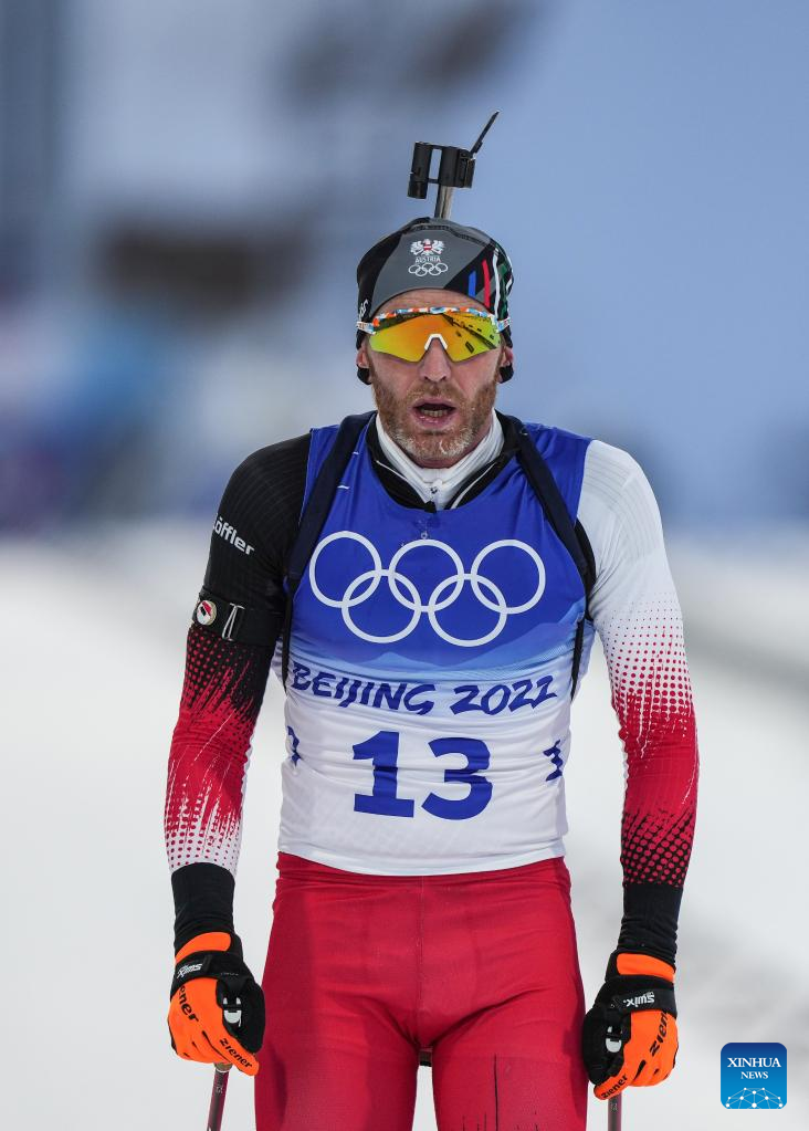 Simon Eder of Austria reacts after biathlon men's 20km individual at National Biathlon Centre in Zhangjiakou, north China's Hebei Province, Feb. 8, 2022. (Xinhua/Peng Ziyang)