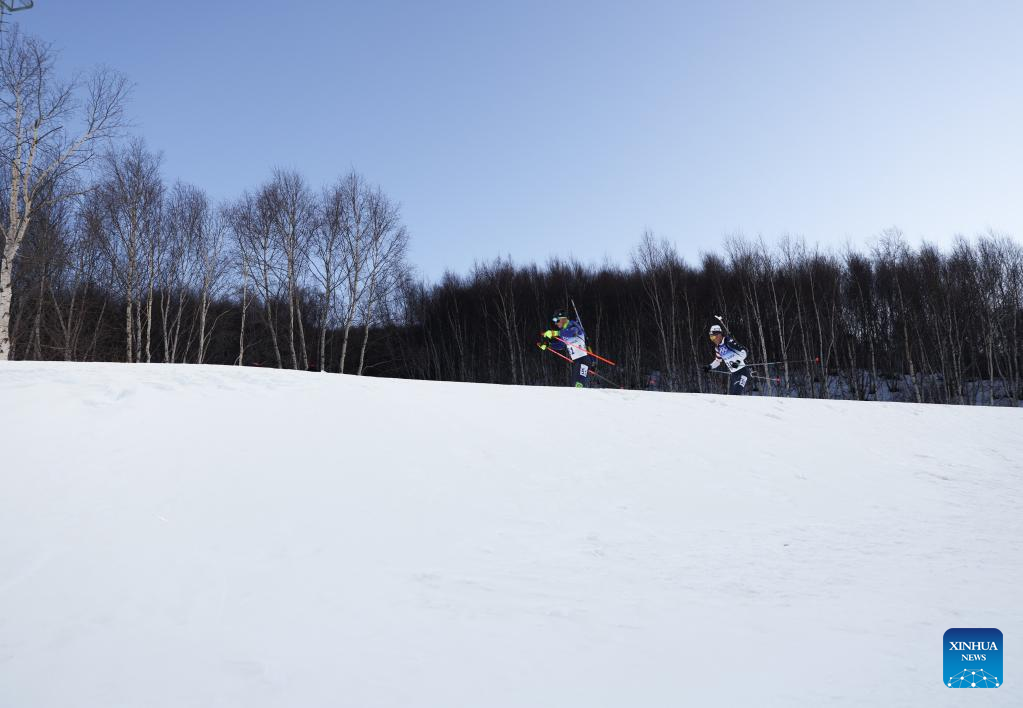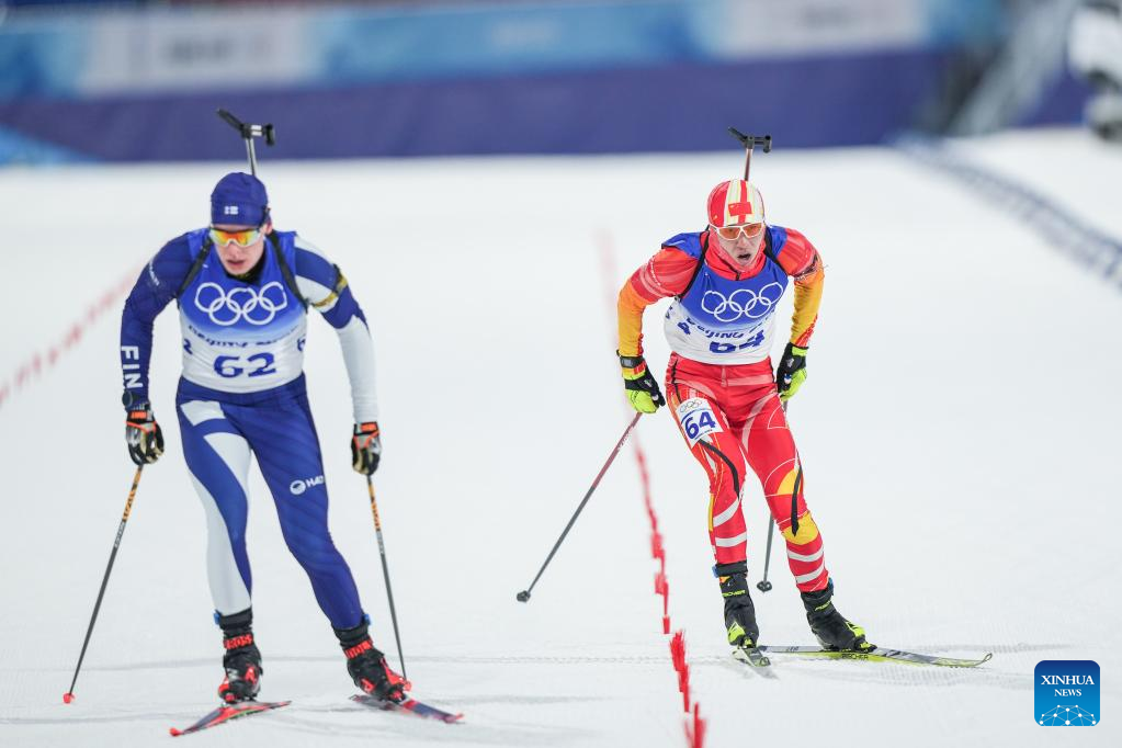 Zhang Chunyu (R) of China crosses the finish line during biathlon men's 20km individual at National Biathlon Centre in Zhangjiakou, north China's Hebei Province, Feb. 8, 2022. (Xinhua/Peng Ziyang)