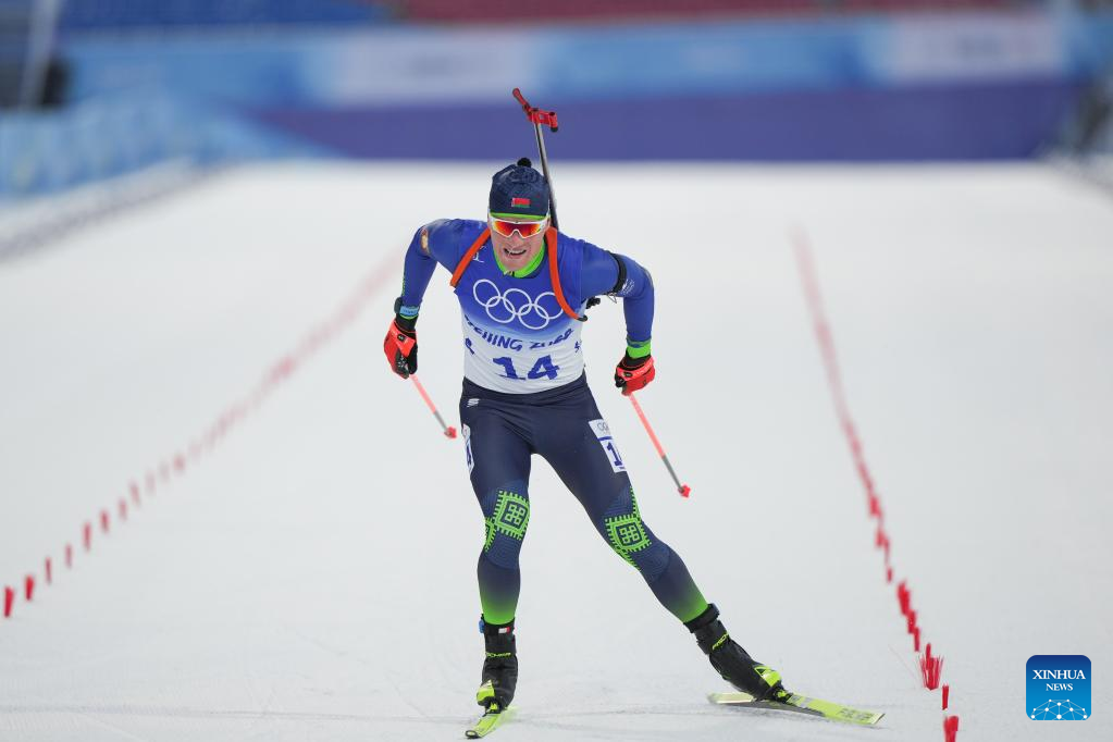 Dzmitry Lazouski of Belarus crosses the finish line during biathlon men's 20km individual at National Biathlon Centre in Zhangjiakou, north China's Hebei Province, Feb. 8, 2022. (Xinhua/Peng Ziyang)