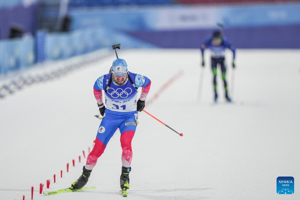 Alexander Loginov of ROC crosses finishing line during biathlon men's 20km individual at National Biathlon Centre in Zhangjiakou, north China's Hebei Province, Feb. 8, 2022. (Xinhua/Peng Ziyang)