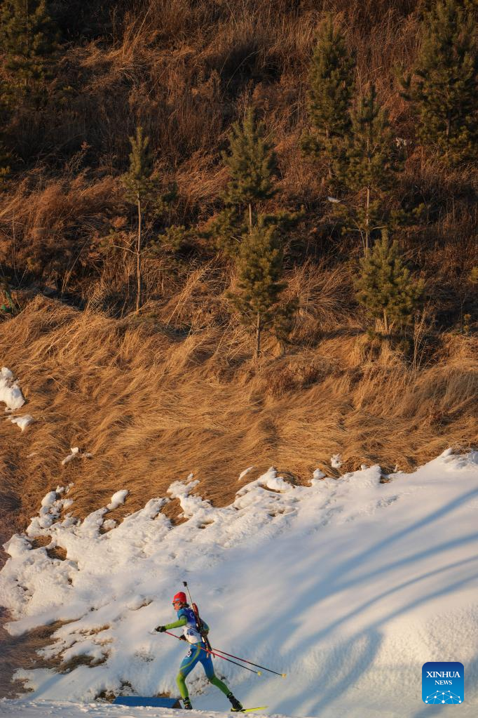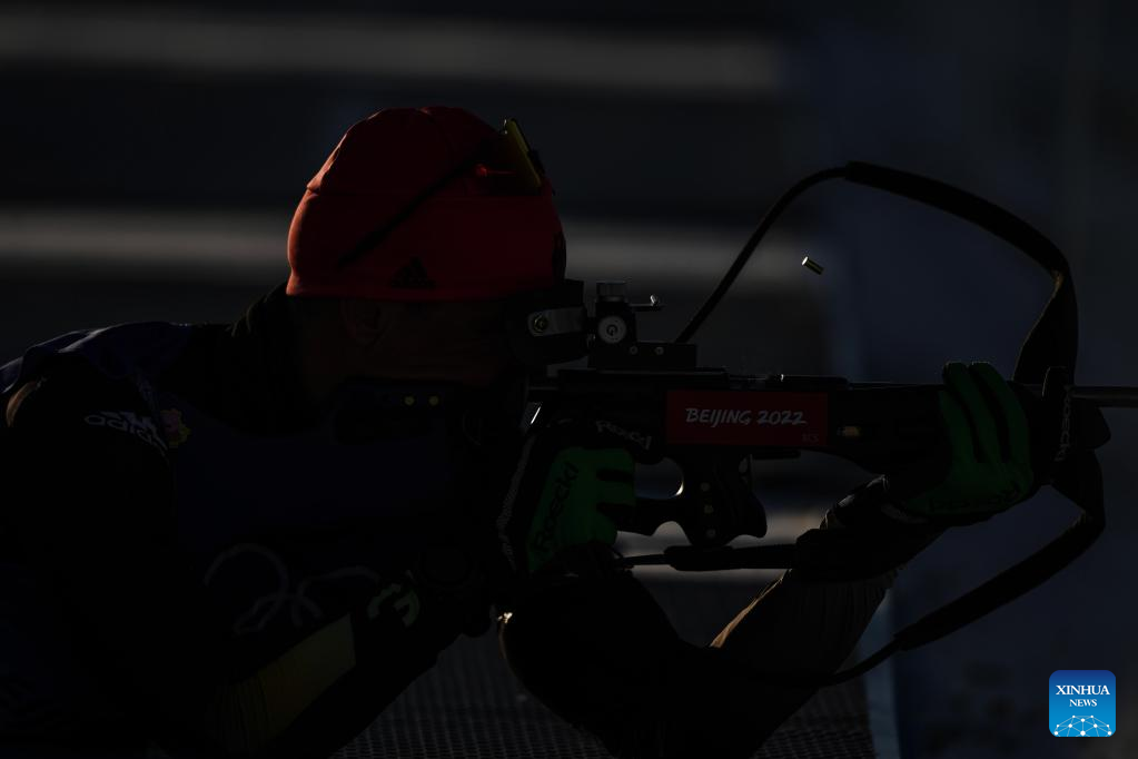 Quentin Fillon Maillet of France trains prior to biathlon men's 20km individual at National Biathlon Centre in Zhangjiakou, north China's Hebei Province, Feb. 8, 2022. (Xinhua/Peng Ziyang)