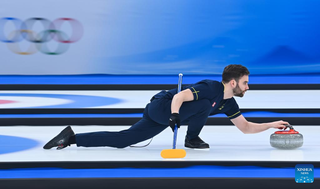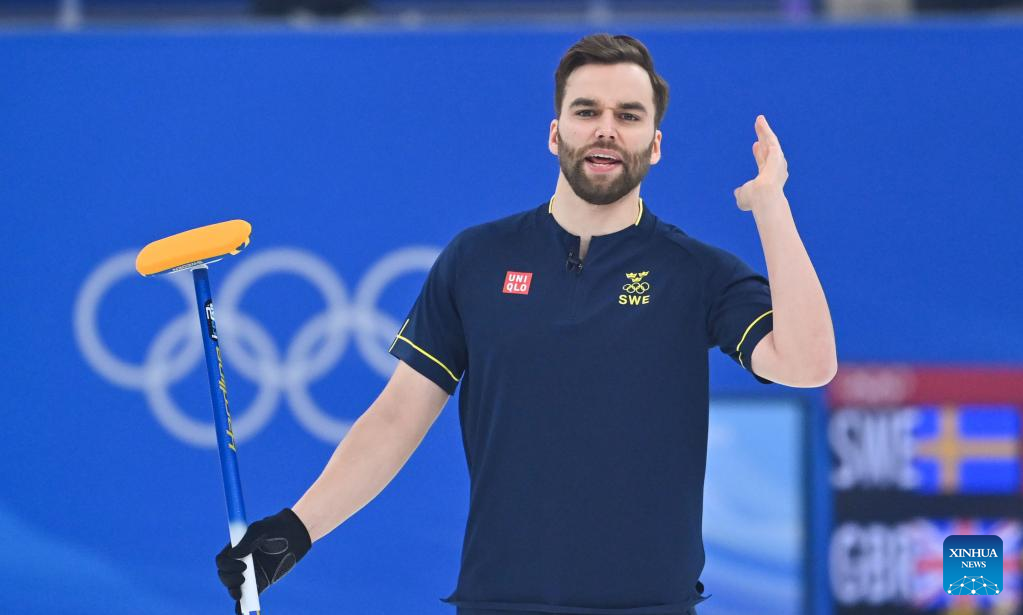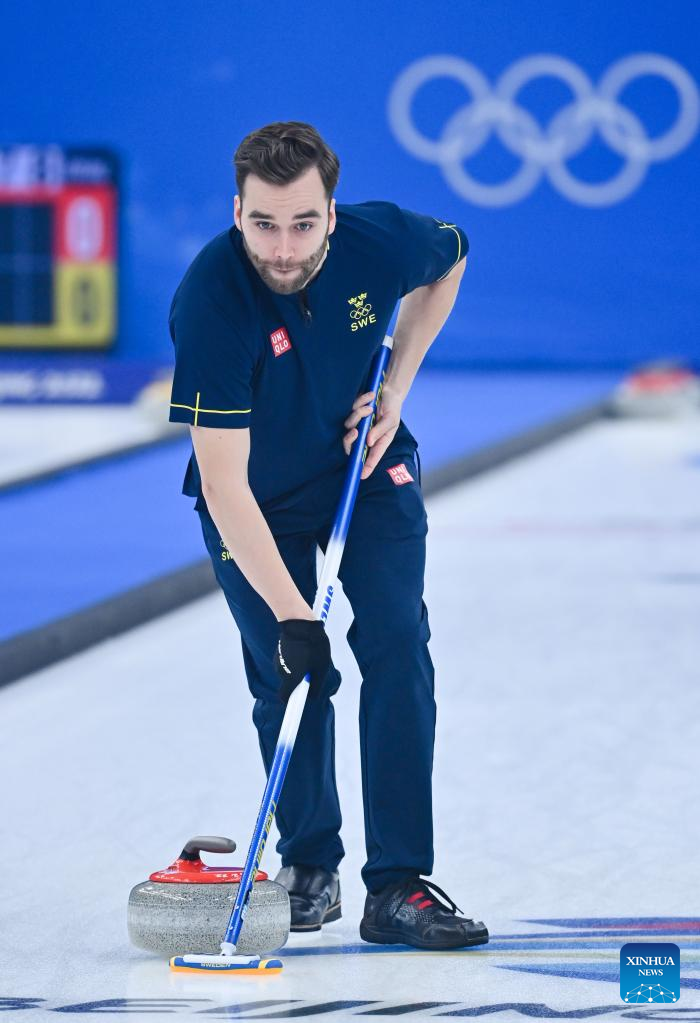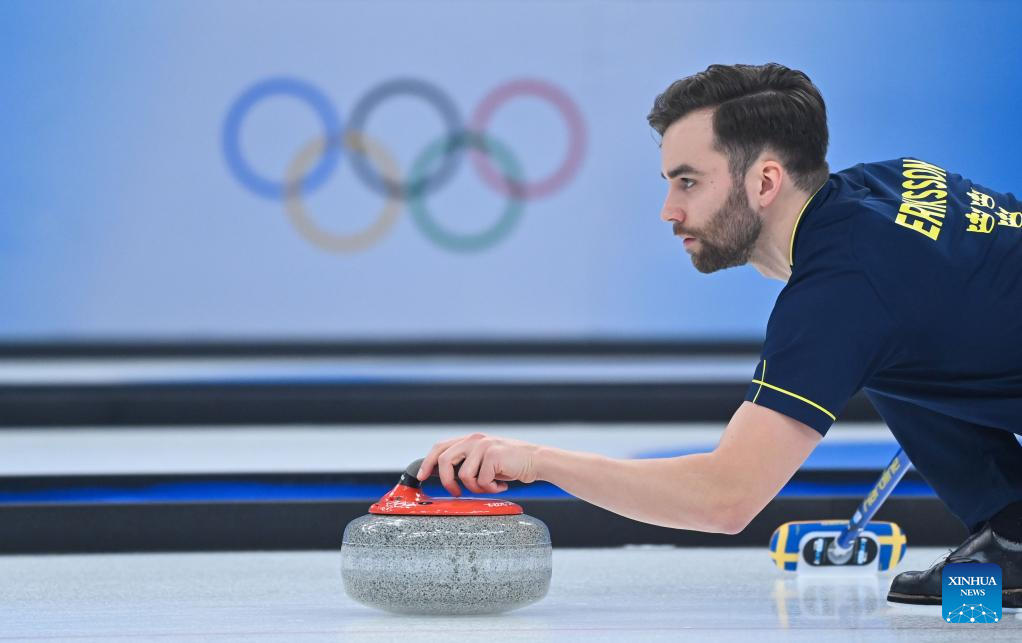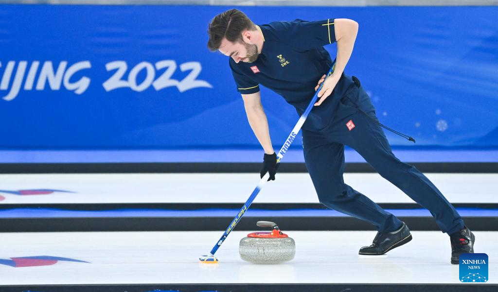 Oskar Eriksson of Sweden competes during the curling mixed doubles bronze medal game of the Beijing 2022 Winter Olympics between Sweden and Great Britain at the National Aquatics Centre in Beijing, capital of China, Feb. 8, 2022. (Xinhua/Huang Xiaobang)