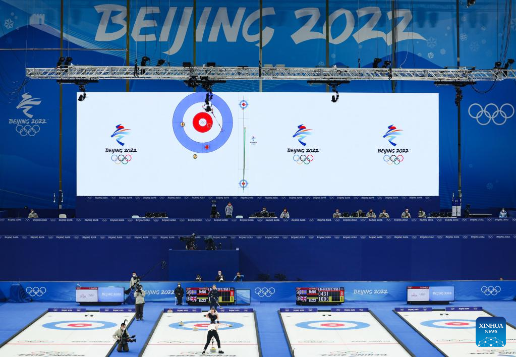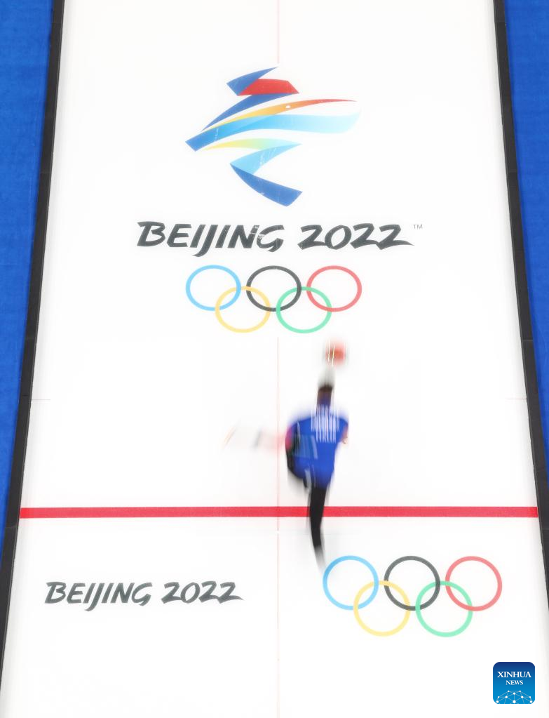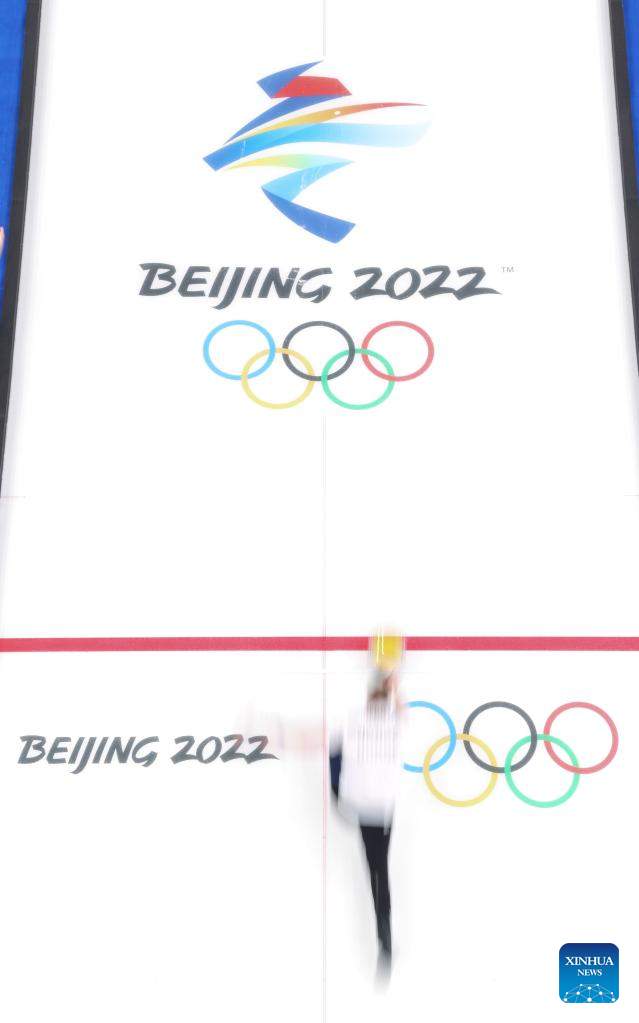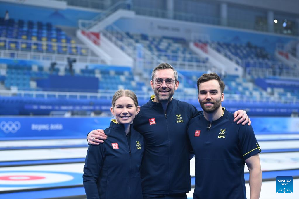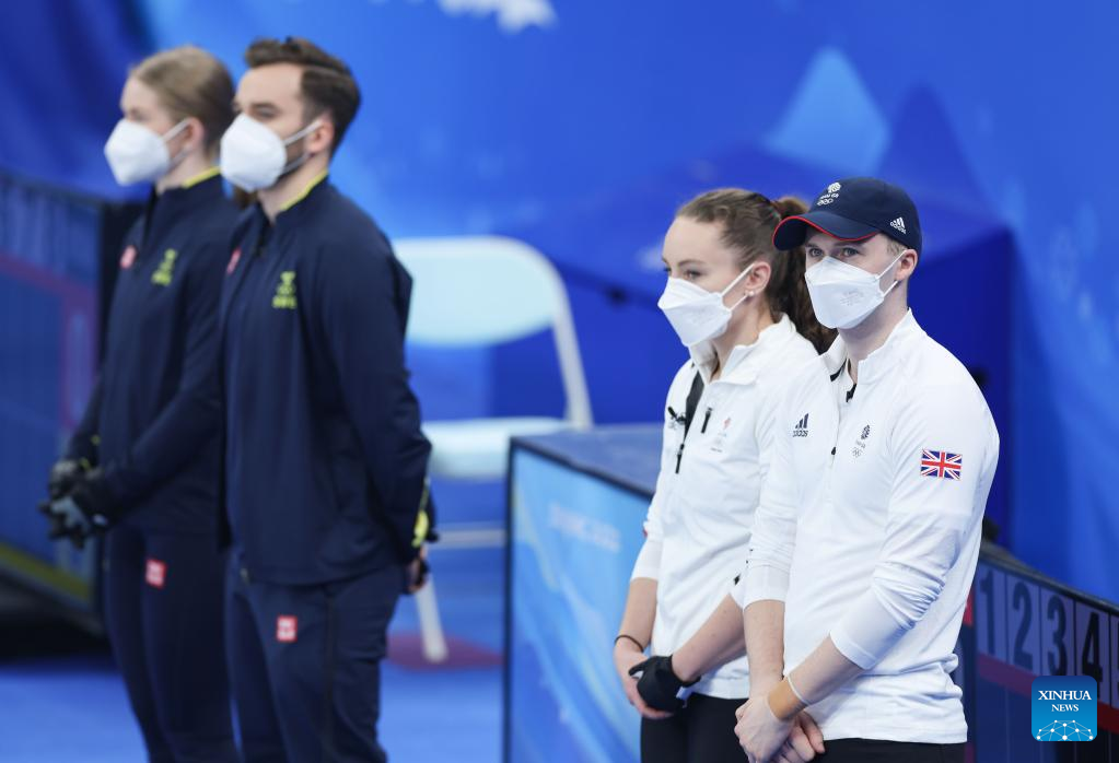 Atheletes of Sweden (L) and Britain are seen before the curling mixed doubles bronze medal game of the Beijing 2022 Winter Olympics between Sweden and Great Britain at the National Aquatics Centre in Beijing, capital of China, Feb. 8, 2022. (Xinhua/Wang Jingqiang)