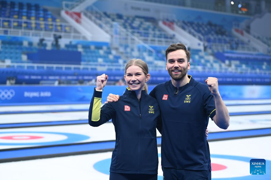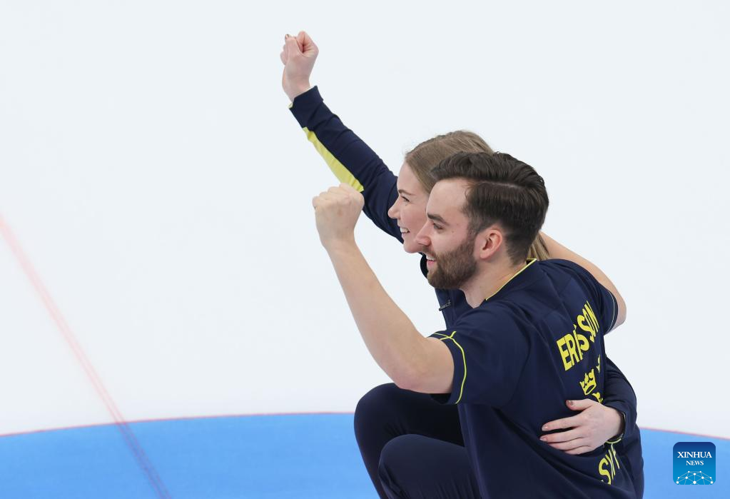 Almida De Val (L) and Oskar Eriksson of Sweden celebrate winning during the curling mixed doubles bronze medal game of the Beijing 2022 Winter Olympics between Sweden and Great Britain at the National Aquatics Centre in Beijing, capital of China, Feb. 8, 2022. (Xinhua/Huang Xiaobang)
