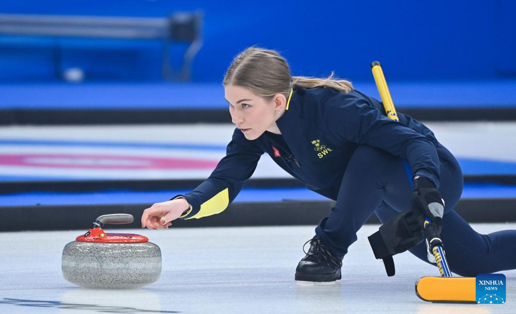 Almida de Val of Sweden competes during the curling mixed doubles bronze medal game of the Beijing 2022 Winter Olympics between Sweden and Britain at the National Aquatics Centre in Beijing, capital of China, Feb. 8, 2022. (Xinhua/Huang Xiaobang)