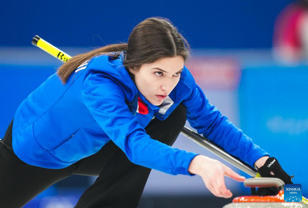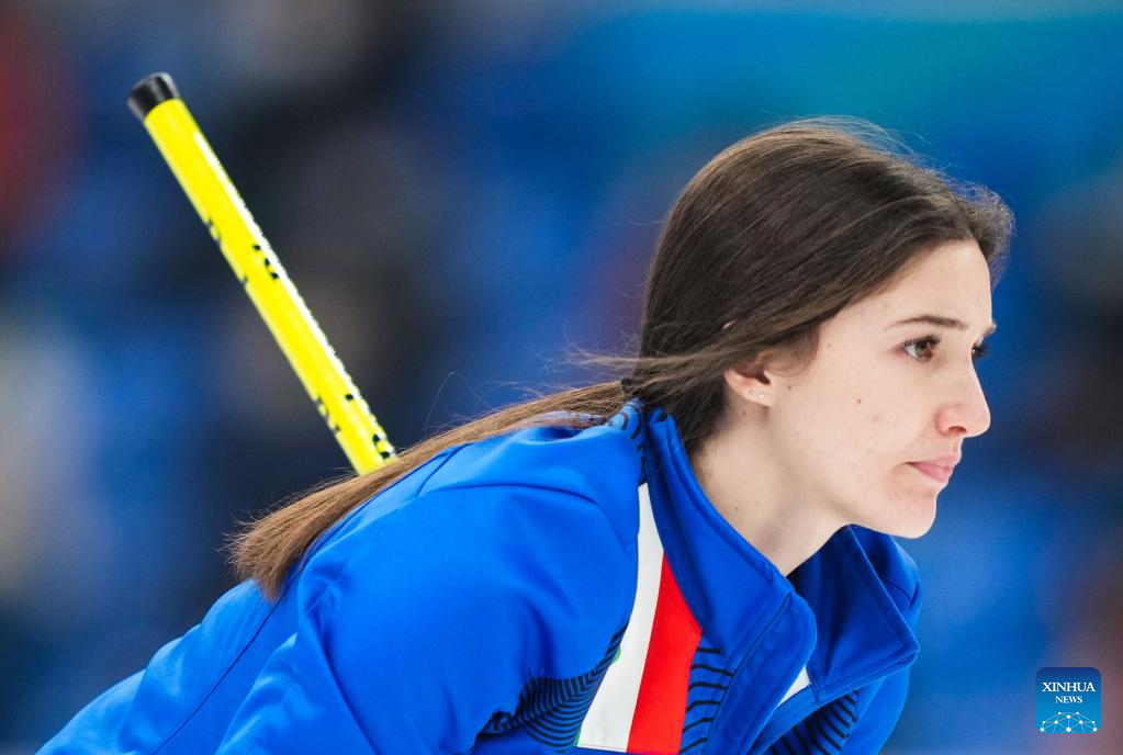 Stefania Constantini of Italy competes during the curling mixed doubles gold medal game of the Beijing 2022 Winter Olympics between Italy and Norway at the National Aquatics Centre in Beijing, capital of China, Feb. 8, 2022. (Xinhua/Zhou Mi)