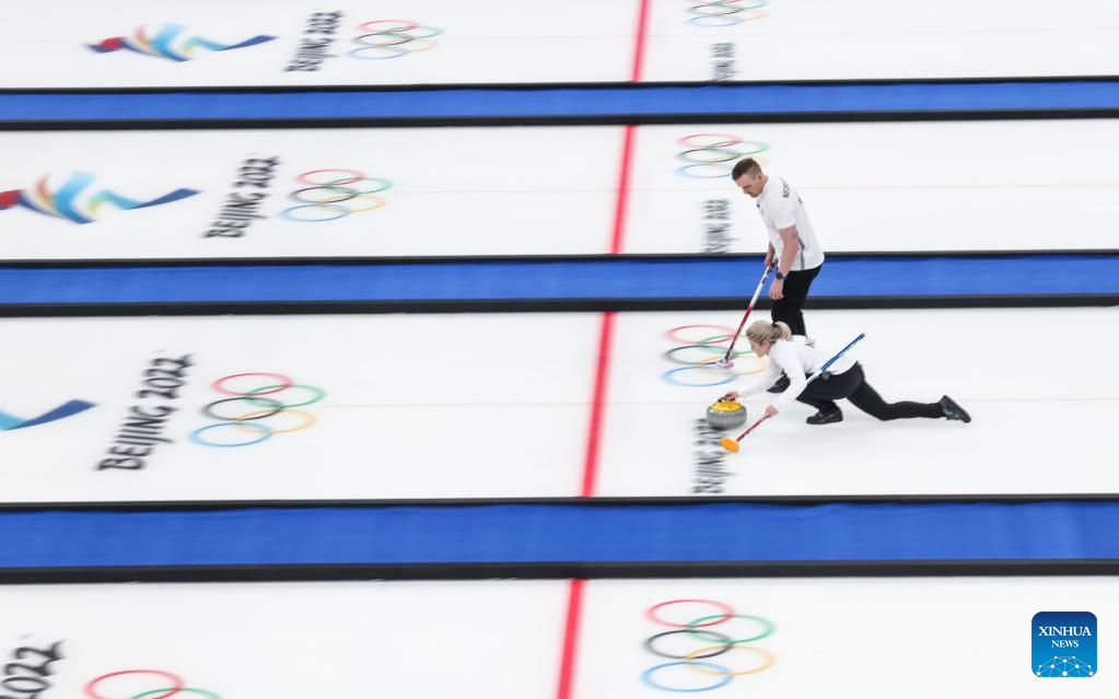 Bruce Mouat (bottom) of Great Britain competes during the curling mixed doubles bronze medal game of the Beijing 2022 Winter Olympics between Sweden and Great Britain at the National Aquatics Centre in Beijing, capital of China, Feb. 8, 2022. (Xinhua/Wang Jingqiang)