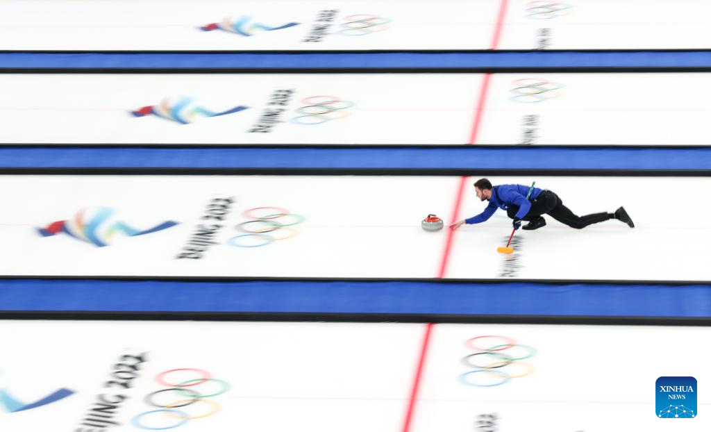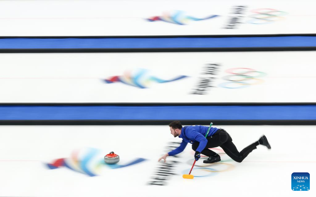 Amos Mosaner of Italy competes during the curling mixed doubles gold medal game of the Beijing 2022 Winter Olympics between Italy and Norway at the National Aquatics Centre in Beijing, capital of China, Feb. 8, 2022. (Xinhua/Yang Lei)