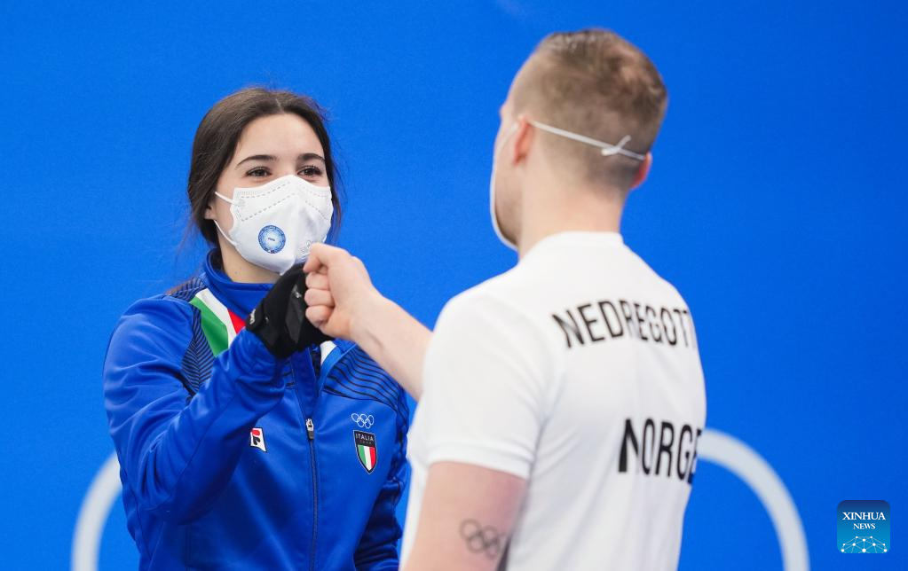 Stefania Constantini (L) of Italy greets Magnus Nedregotten of Norway before the curling mixed doubles gold medal game of the Beijing 2022 Winter Olympics between Italy and Norway at the National Aquatics Centre in Beijing, capital of China, Feb. 8, 2022. (Xinhua/Zhou Mi)