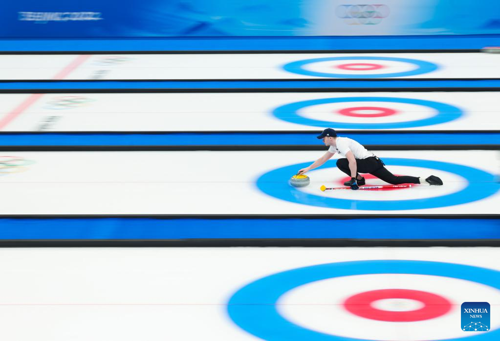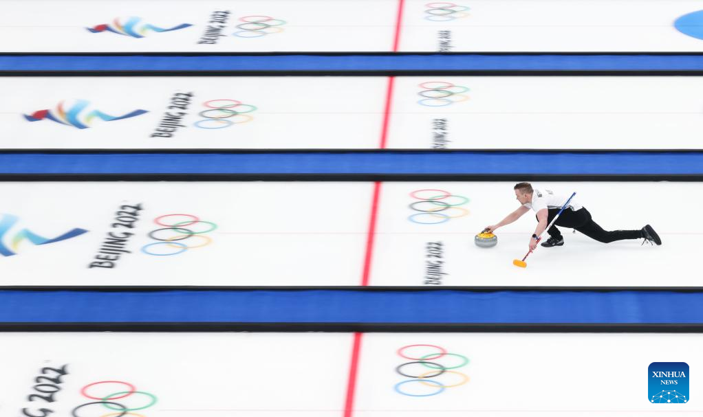 Bruce Mouat of Britain competes during the curling mixed doubles bronze medal game of the Beijing 2022 Winter Olympics between Sweden and Britain at the National Aquatics Centre in Beijing, capital of China, Feb. 8, 2022. (Xinhua/Huang Xiaobang)