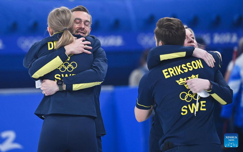 Members of Swedish team celebrate after the curling mixed doubles bronze medal game of the Beijing 2022 Winter Olympics between Sweden and Great Britain at the National Aquatics Centre in Beijing, capital of China, Feb. 8, 2022. (Xinhua/Huang Xiaobang)