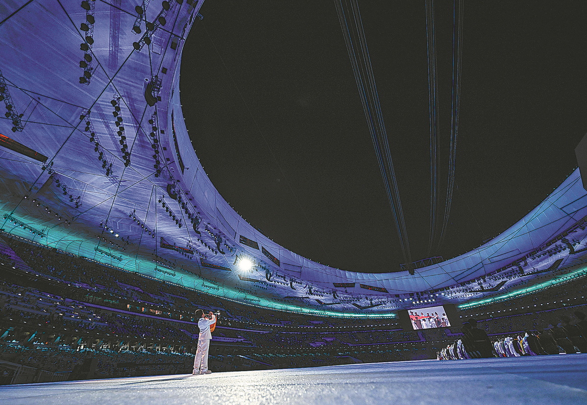 During the ceremony at the iconic venue, formally known as the National Stadium, Zhu De'en, a Beijing primary school student, played the song Me and My Motherland, well-known in China, as representatives from all walks of life and the nation's 56 ethnic groups passed the national flag to the flagpole.