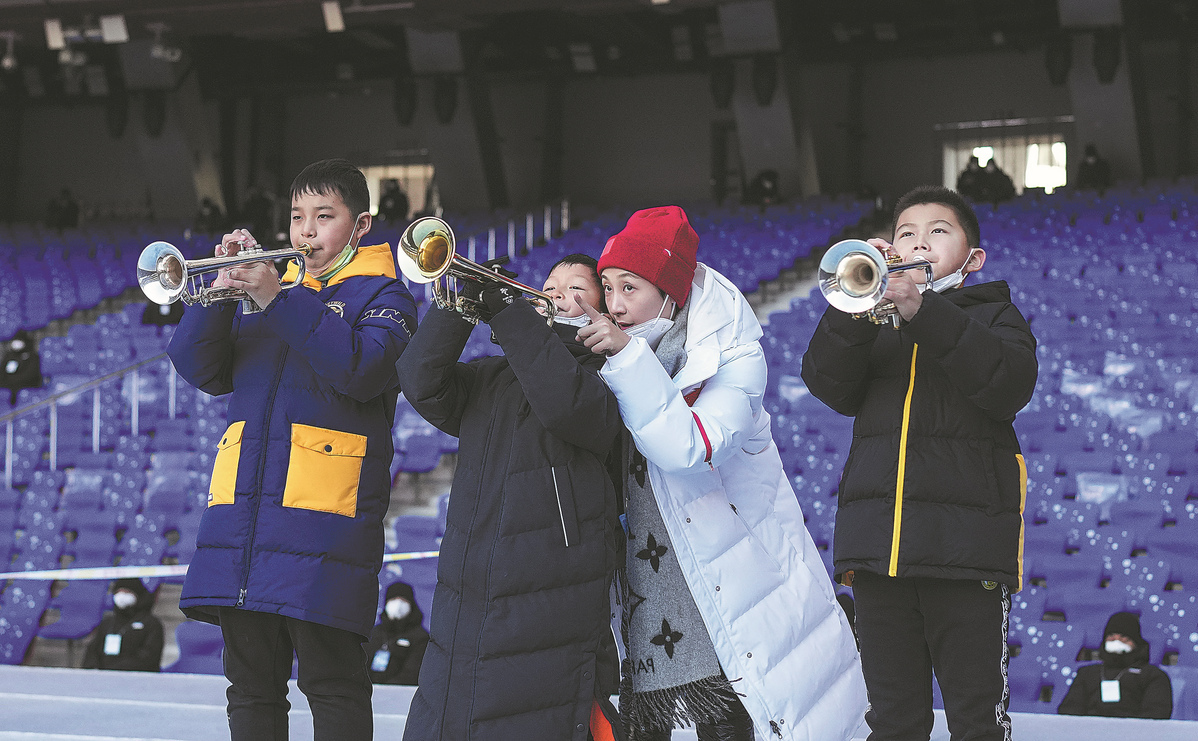 Under the guidance of a director, young trumpeter Zhu De'en (center) practices for the opening ceremony of the 2022 Beijing Winter Olympics with understudies Liang Tong (left) and Liu Haoran on Jan 27. [Photo/Xinhua]