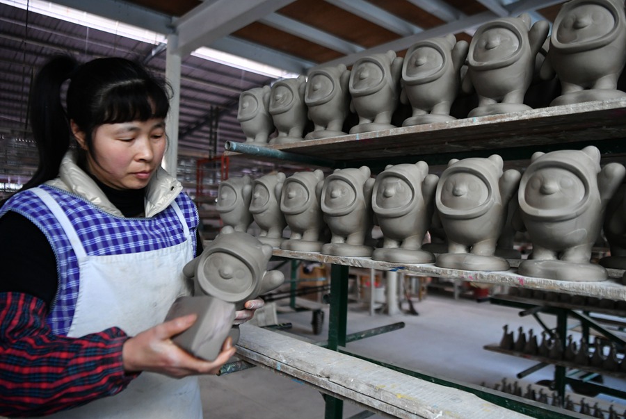 A worker puts newly-made porcelain figures of Shuey Rhon Rhon, the mascot of the Beijing 2022 Paralympic Winter Games on the shelf. (Photo/Chen Xiaoyang)