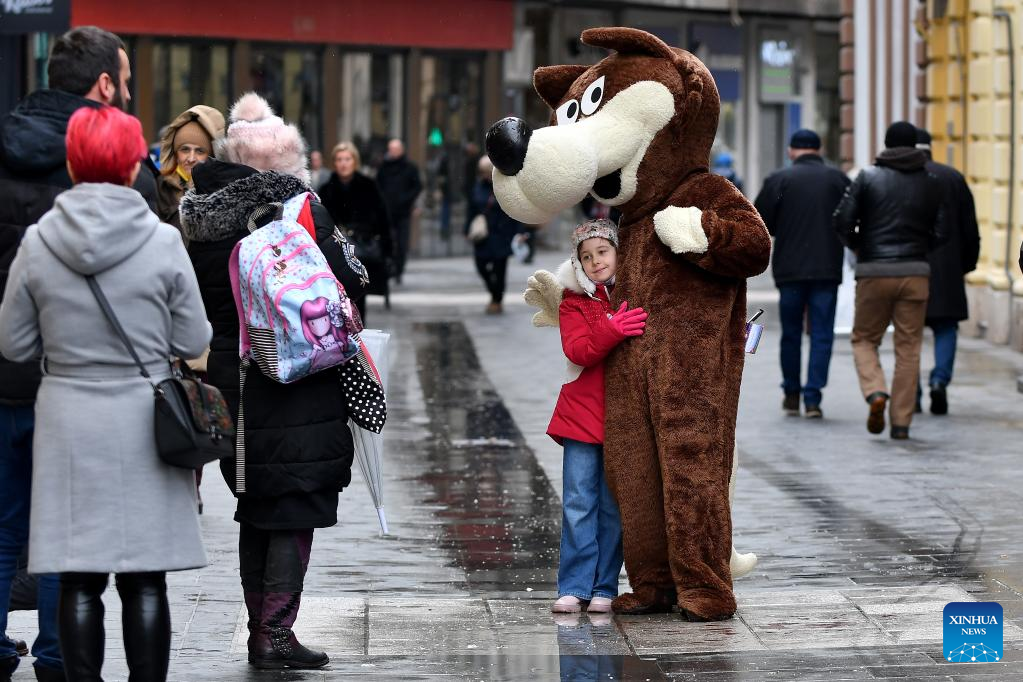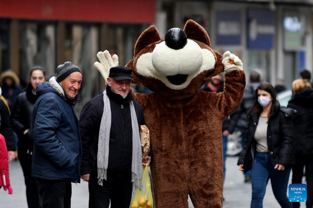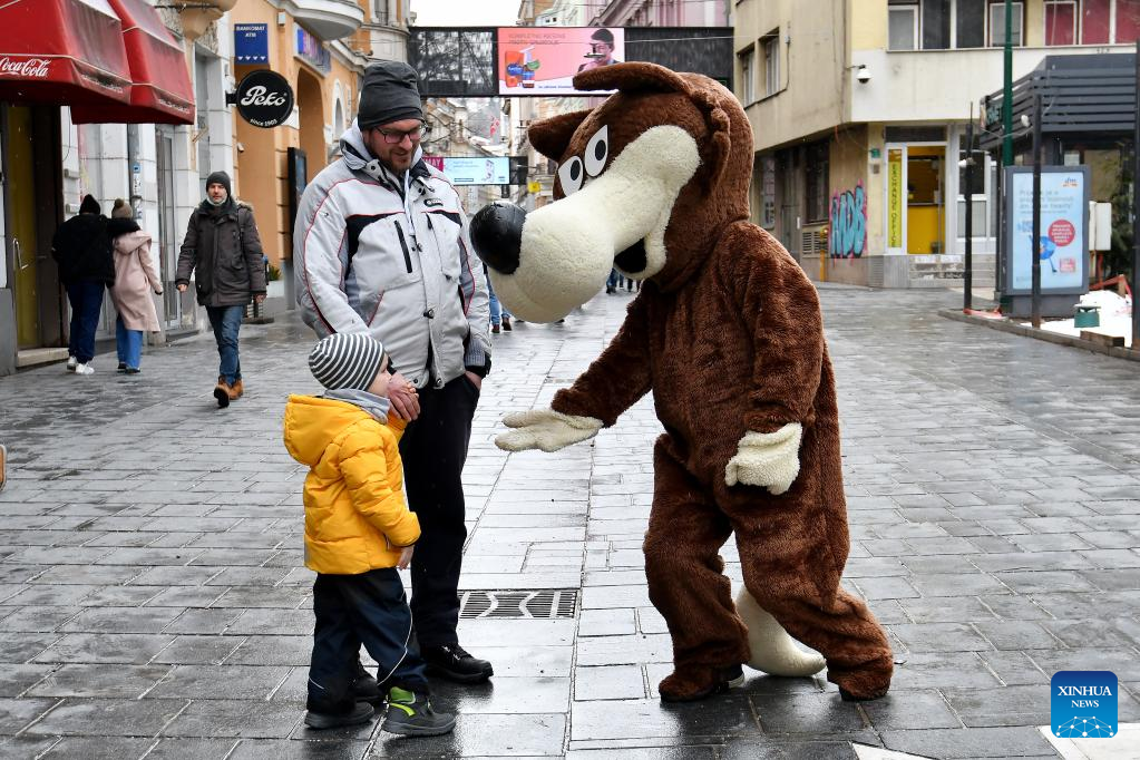 Vucko, mascot of the 1984 Sarajevo Winter Olympics, poses for photos with people in Sarajevo, Bosnia and Herzegovina, Feb. 8, 2022. On the occasion of marking the 38th anniversary of the opening of the 1984 Sarajevo Winter Olympics, Vucko, mascot of the Games, walked on streets in Sarajevo and attracted the attention of citizens and visitors. (Xinhua/Nedim Grabovica)