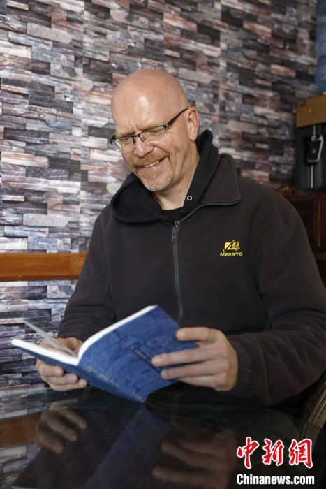 Photo shows Jason Pym and his first illustration book – A Dali Sketchbook - on Jan. 11. (China News Service/Li Jiaxian)
