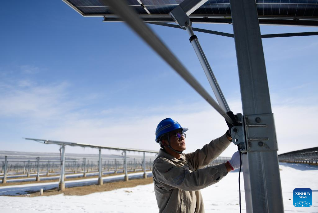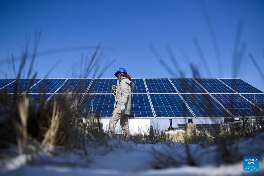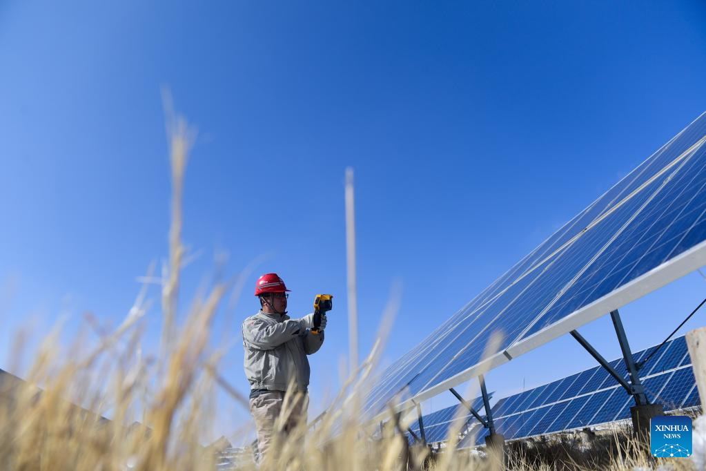 A staff member inspects a photovoltaic (PV) power station in Gonghe County of Hainan Tibetan Autonomous Prefecture in northwest China's Qinghai Province, Feb. 8, 2022. Parts of Qinghai are faced with temperature drop and snowfall recently. Staff members of a power company enhanced the inspection of the PV power station to maintain the power supply during bad weather. (Xinhua/Zhang Long)