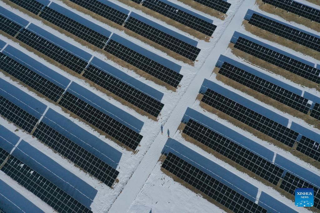 Aerial photo shows a photovoltaic (PV) power station in Gonghe County of Hainan Tibetan Autonomous Prefecture in northwest China's Qinghai Province, Feb. 8, 2022. Parts of Qinghai are faced with temperature drop and snowfall recently. Staff members of a power company enhanced the inspection of the PV power station to maintain the power supply during bad weather. (Xinhua/Zhang Long)