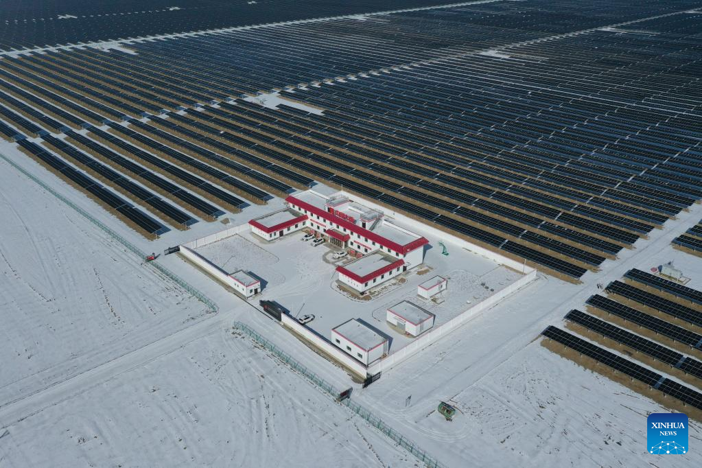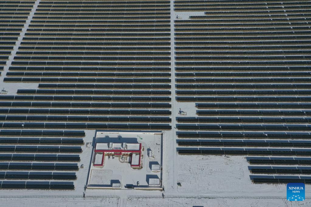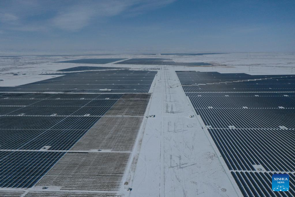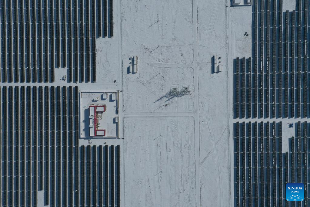 Aerial photo shows a photovoltaic (PV) power station in Gonghe County of Hainan Tibetan Autonomous Prefecture, northwest China's Qinghai Province, Feb. 8, 2022. Parts of Qinghai are faced with temperature drop and snowfall recently. Staff members of a power company enhanced the inspection of the PV power station to maintain the power supply during bad weather. (Xinhua/Zhang Long)