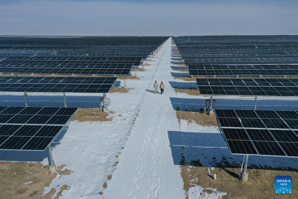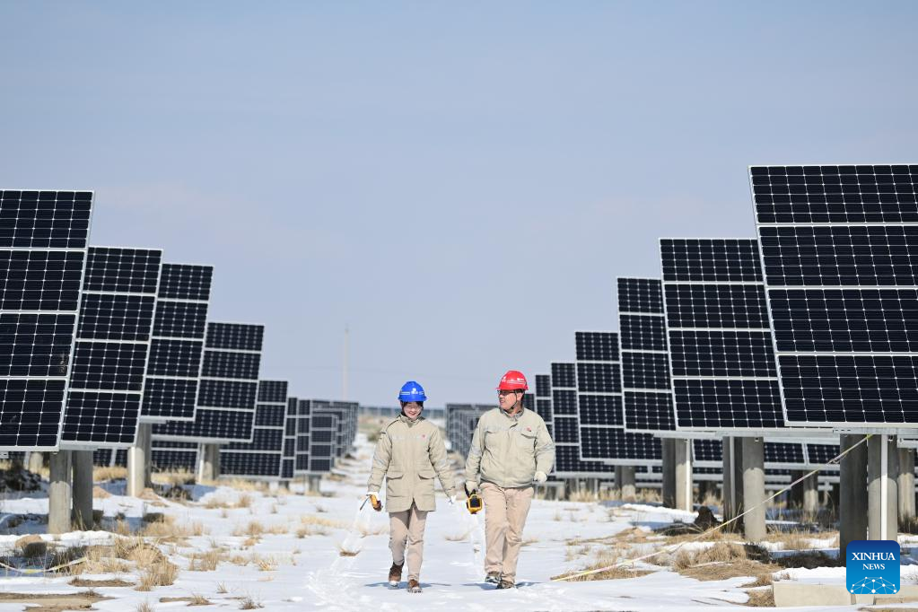 Staff members inspect a photovoltaic (PV) power station in Gonghe County of Hainan Tibetan Autonomous Prefecture in northwest China's Qinghai Province, Feb. 8, 2022. Parts of Qinghai are faced with temperature drop and snowfall recently. Staff members of a power company enhanced the inspection of the PV power station to maintain the power supply during bad weather. (Xinhua/Zhang Long)