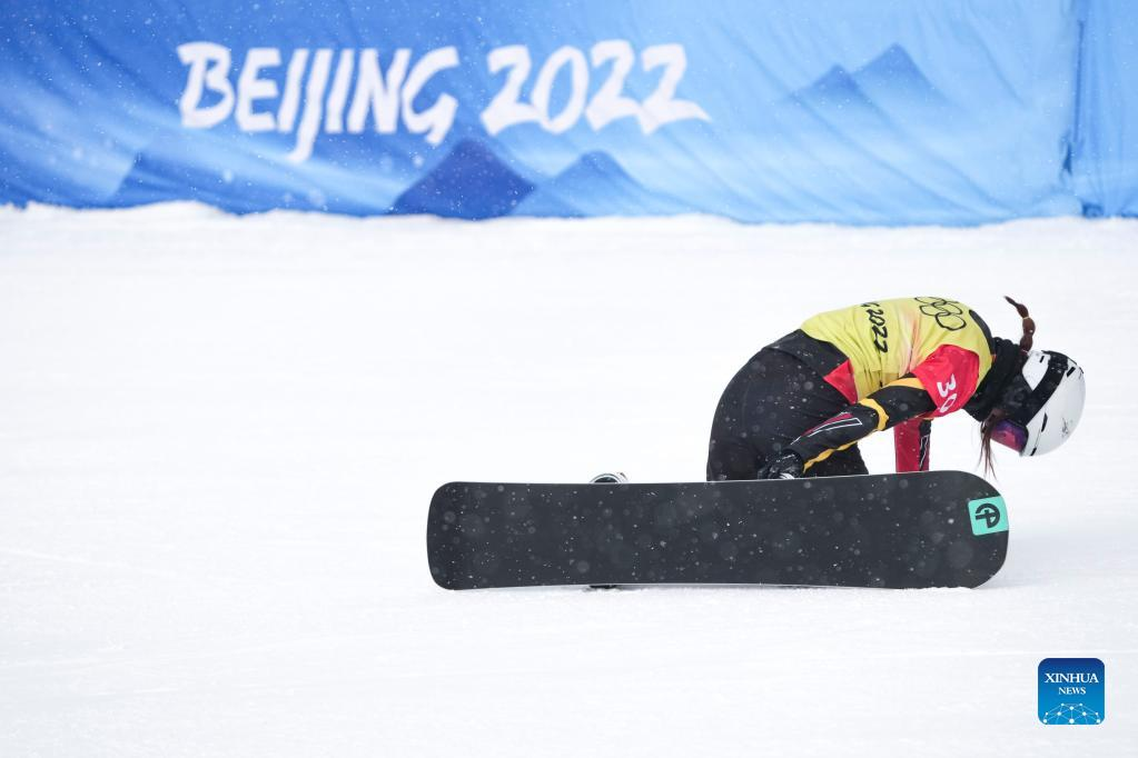 Julia Pereira de Sousa Mabileau of France reacts during women's snowboard cross 1/8 finals of the Beijing 2022 Winter Olympics at Genting Snow Park in Zhangjiakou, north China's Hebei Province, Feb. 9, 2022. (Xinhua/Wang Haofei)