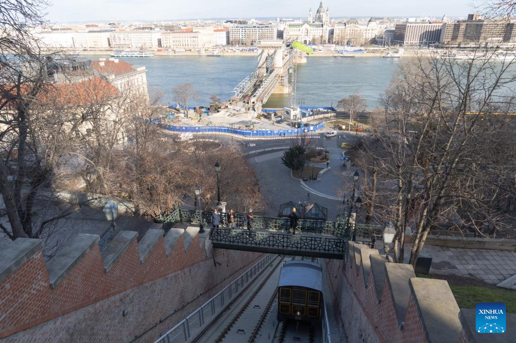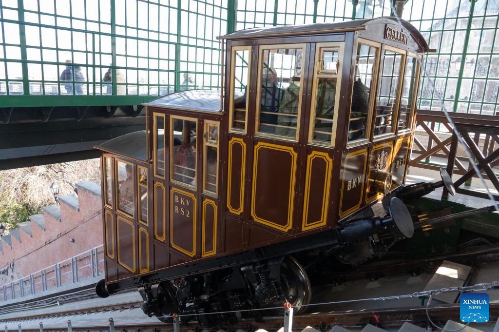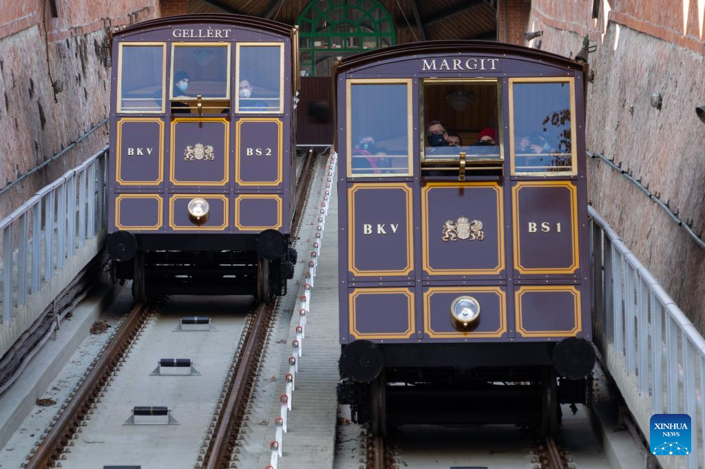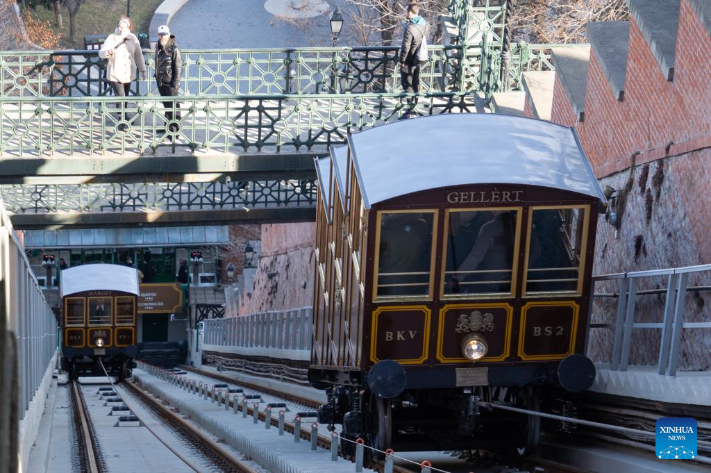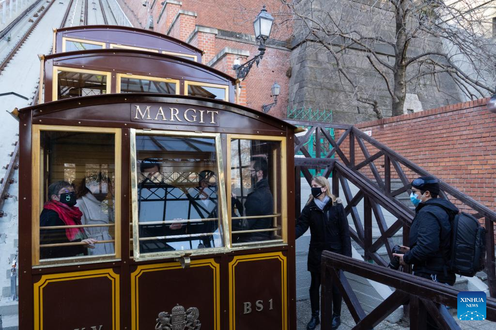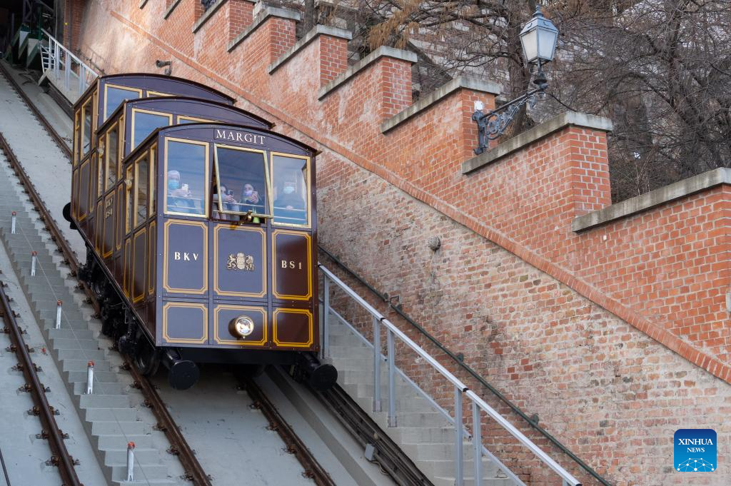 The 152-year-old Buda Castle Hill Funicular is seen as it restarts after a renovation in Budapest, Hungary on Feb. 8, 2022. The Buda Castle Hill Funicular, starting on March 2, 1870, is a tourist attraction of Budapest. After a big renovation, it reopened on Feb. 8. (Photo by Attila Volgyi/Xinhua)