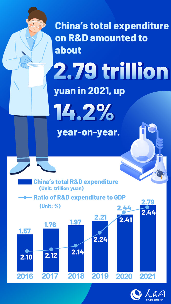 China's spending on research and development (R&D) hit a new high in 2021, with total expenditure on R&D amounting to about 2.79 trillion yuan, up 14.2 percent year-on-year, according to a report released by the National Bureau of Statistics (NBS).