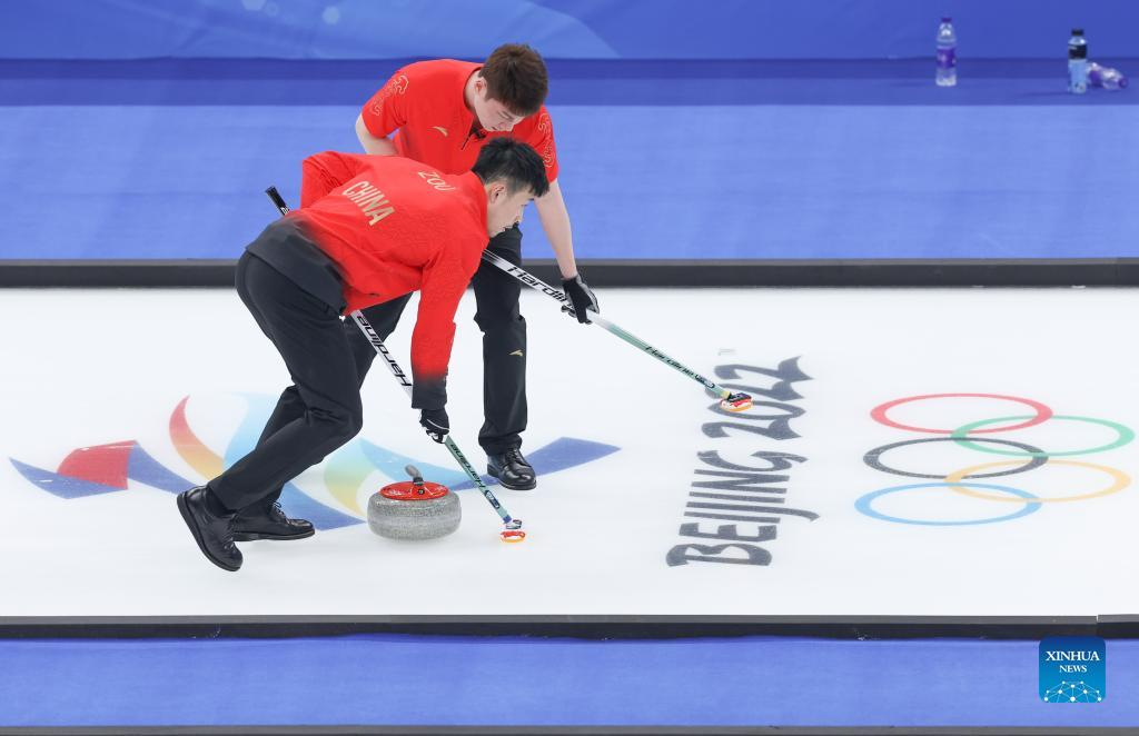 China's Xu Jingtao (L) and Zou Qiang compete during the Curling Men's Round Robin Session 1 of the Beijing 2022 Winter Olympics between China and Sweden at the National Aquatics Centre in Beijing, capital of China, Feb. 9, 2022. (Xinhua/Wang Jingqiang)