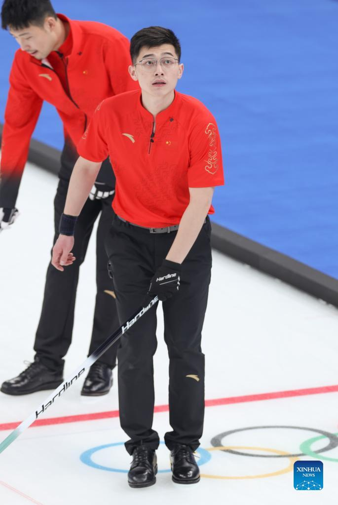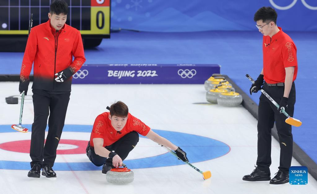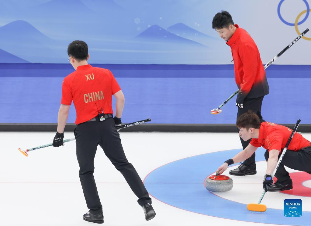 Wang Zhiyu (1st R) of China competes during the Curling Men's Round Robin Session 1 of the Beijing 2022 Winter Olympics between China and Sweden at the National Aquatics Centre in Beijing, capital of China, Feb. 9, 2022. (Xinhua/Wang Jingqiang)