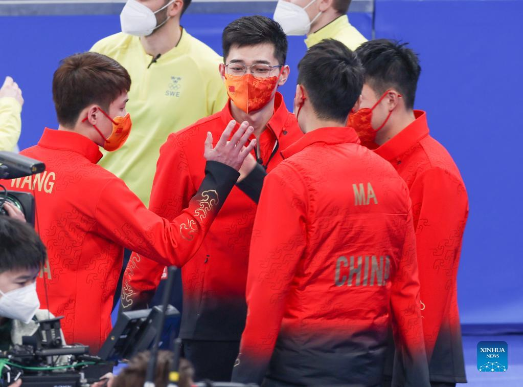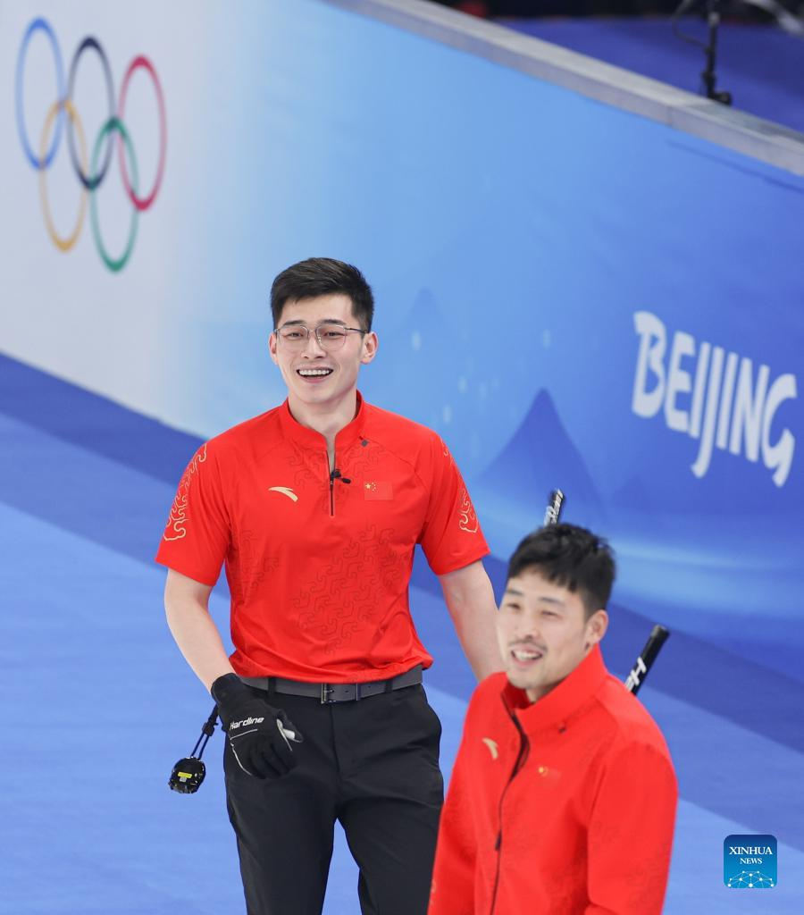 Team China react before the Curling Men's Round Robin Session 1 of the Beijing 2022 Winter Olympics between China and Sweden at the National Aquatics Centre in Beijing, capital of China, Feb. 9, 2022. (Xinhua/Wang Jingqiang)
