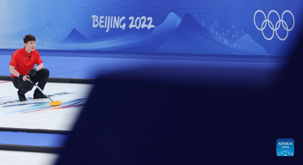 China's Wang Zhiyu competes during the Curling Men's Round Robin Session 1 of the Beijing 2022 Winter Olympics between China and Sweden at the National Aquatics Centre in Beijing, capital of China, Feb. 9, 2022. (Xinhua/Wang Jingqiang)