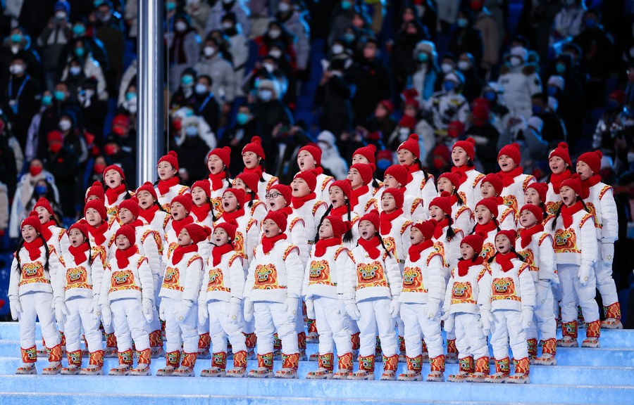 A children's choir sing the Olympic Anthem during the opening ceremony of the Beijing 2022 Olympic Winter Games at the National Stadium in Beijing, Feb. 4, 2022. (Xinhua/Cao Can)