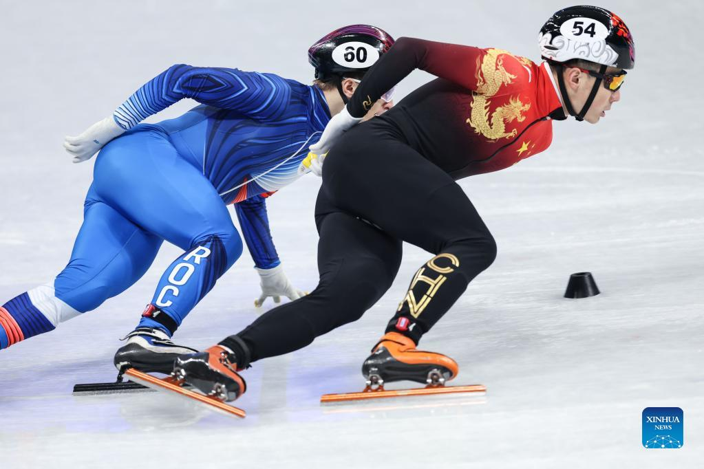 Ren Ziwei (R) of China competes during the men's 1,500m quarterfinal of short track speed skating at Capital Indoor Stadium in Beijing, capital of China, Feb. 9, 2022. (Xinhua/Lan Hongguang)