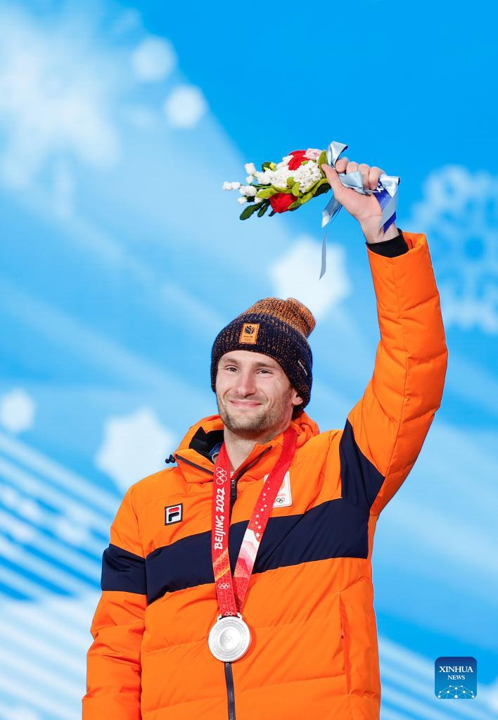 Silver medalist Thomas Krol of the Netherlands reacts during the awarding ceremony of speed skating men's 1,500m at the Beijing Medals Plaza of the Winter Olympics in Beijing, capital of China, Feb. 9, 2022. (Xinhua/Huang Zongzhi)