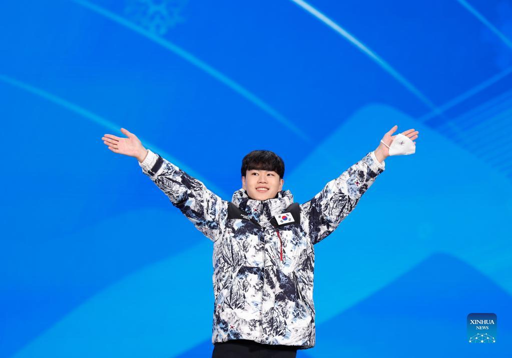 Bronze medalist Kim Minseok of South Korea poses for photos during the awarding ceremony of speed skating men's 1,500m at the Beijing Medals Plaza of the Winter Olympics in Beijing, capital of China, Feb. 9, 2022. (Xinhua/Huang Zongzhi)