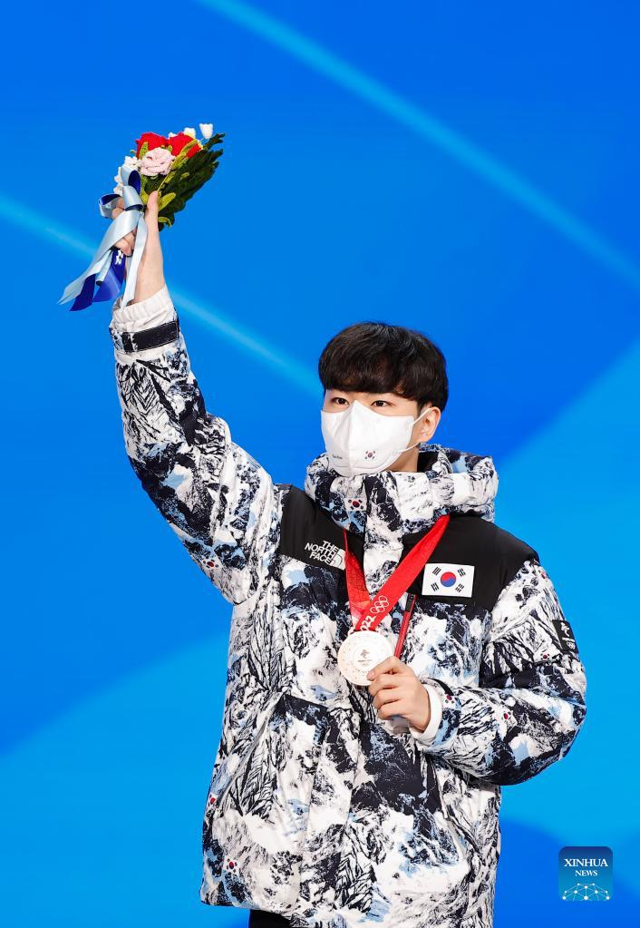 Bronze medalist Kim Minseok of South Korea poses for photos during the awarding ceremony of speed skating men's 1,500m at the Beijing Medals Plaza of the Winter Olympics in Beijing, capital of China, Feb. 9, 2022. (Xinhua/Ding Xu)