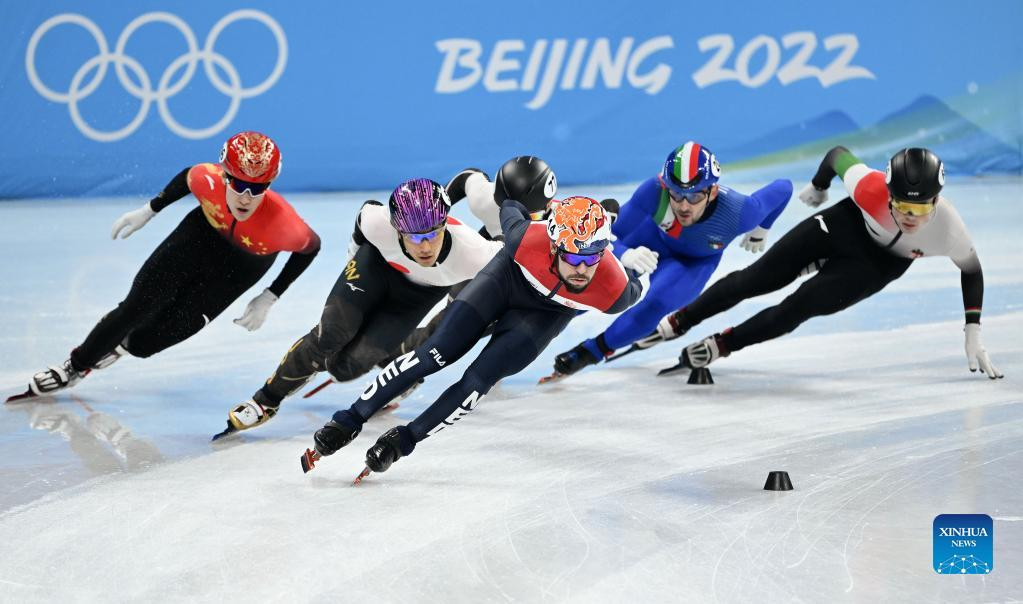Shaolin Sandor Liu of Hungary competes during the men's 1,500m quarterfinal of short track speed skating at Capital Indoor Stadium in Beijing, capital of China, Feb. 9, 2022. (Xinhua/Li Yibo)