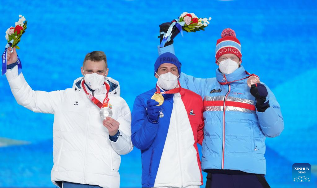 Gold medalist Quentin Fillon Maillet (C) of France, Sliver medalist Anton Smolski (L) of Belarus and Bronze medalist Johannes Thingnes Boe of Norway pose for photos during the awarding ceremony of biathlon men's 20km individual at Zhangjiakou Medals Plaza of the Winter Olympics in Zhangjiakou, north China's Hebei Province, Feb. 9, 2022. (Xinhua/Ding Ting)