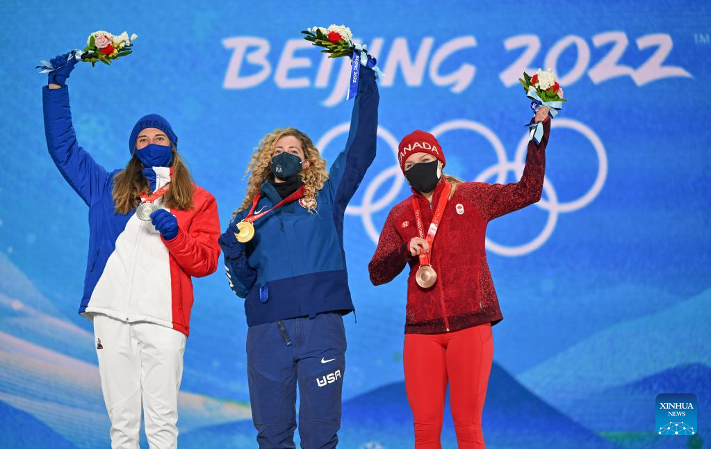 Gold medalist Lindsey Jacobellis (C) of the United States, Silver medalist Chloe Trespeuch (L) of France and Bronze medalist Meryeta Odine of Canada pose for photos during the awarding ceremony of women's snowboard cross at Zhangjiakou Medals Plaza of the Winter Olympics in Zhangjiakou, north China's Hebei Province, Feb. 9, 2022. (Xinhua/Guo Cheng)