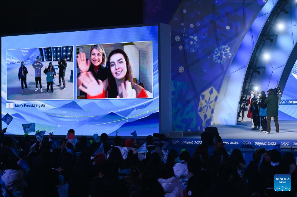 Medalists make video call with family members after the awarding ceremony of men's freeski big air at the Beijing Medals Plaza of the Winter Olympics in Beijing, capital of China, Feb. 9, 2022. (Xinhua/Huang Zongzhi)
