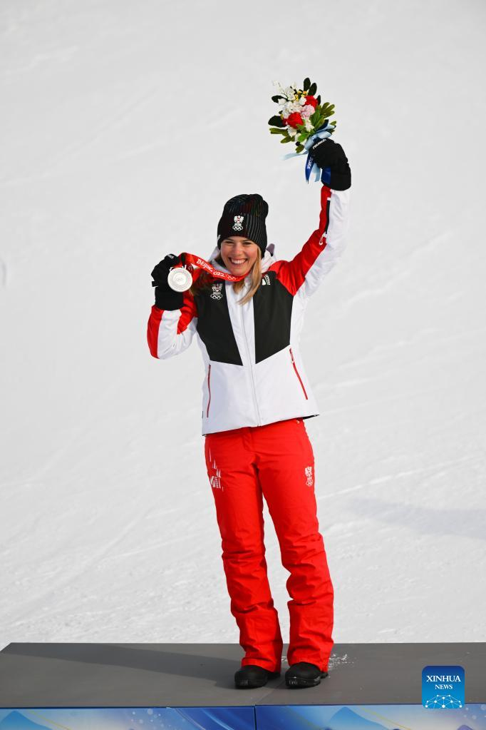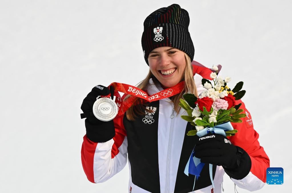 Silver medalist Katharina Liensberger of Austria poses for photos during the awarding ceremony of alpine skiing women's slalom at the National Alpine Skiing Centre in Yanqing District, Beijing, capital of China, Feb. 9, 2022. (Xinhua/Lian Zhen)