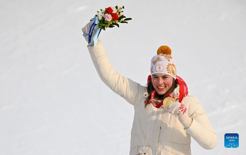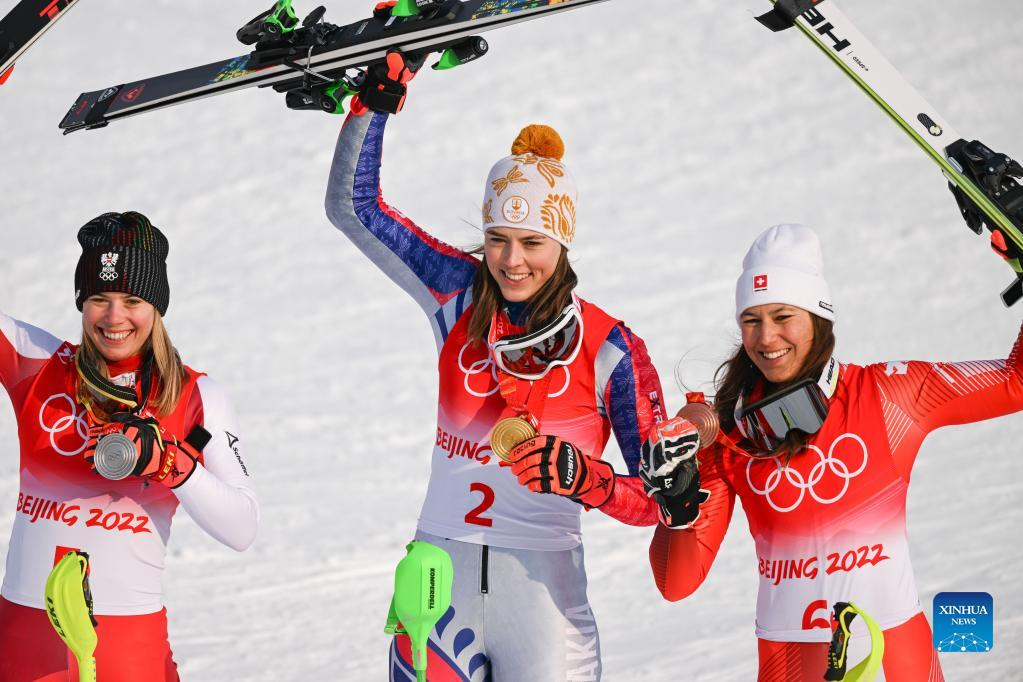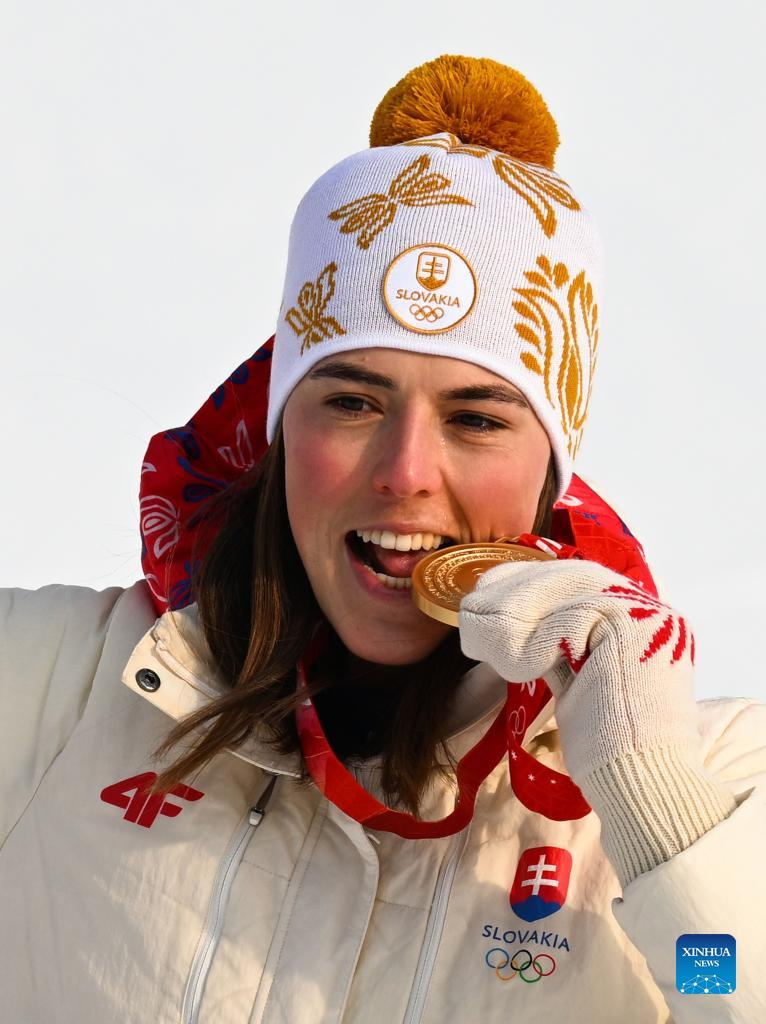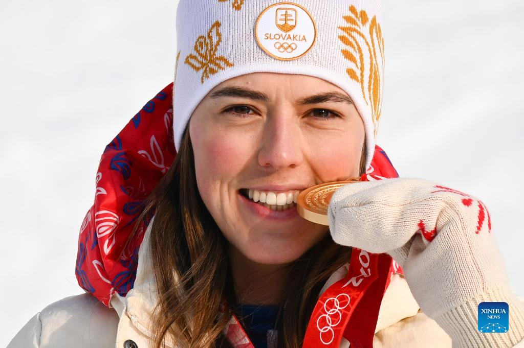 Gold medalist Petra Vlhova of Slovakia poses for photos during the awarding ceremony of alpine skiing women's slalom at the National Alpine Skiing Centre in Yanqing District, Beijing, capital of China, Feb. 9, 2022. (Xinhua/Lian Zhen)