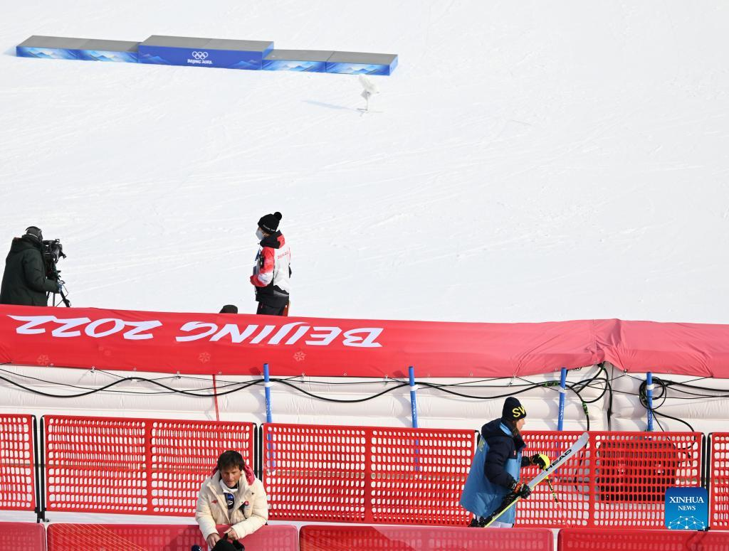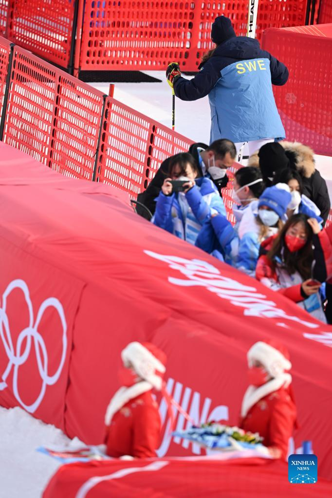 Sara Hector (top) of Sweden passes by the podium during awarding ceremony of alpine skiing women's slalom at the National Alpine Skiing Centre in Yanqing District, Beijing, capital of China, Feb. 9, 2022. (Xinhua/Lian Zhen)