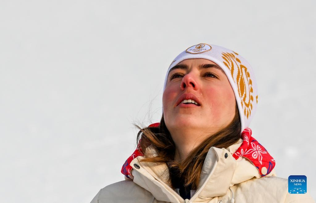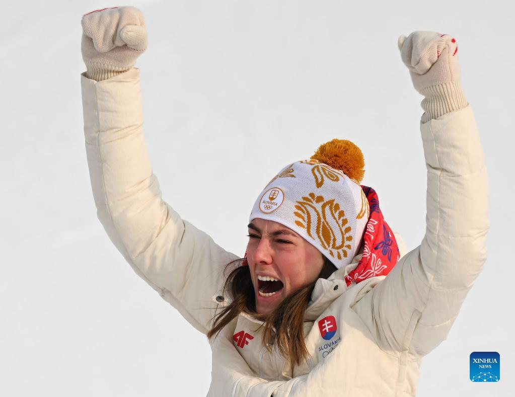 Gold medalist Petra Vlhova of Slovakia reacts during the awarding ceremony of alpine skiing women's slalom at the National Alpine Skiing Centre in Yanqing District, Beijing, capital of China, Feb. 9, 2022. (Xinhua/Lian Zhen)
